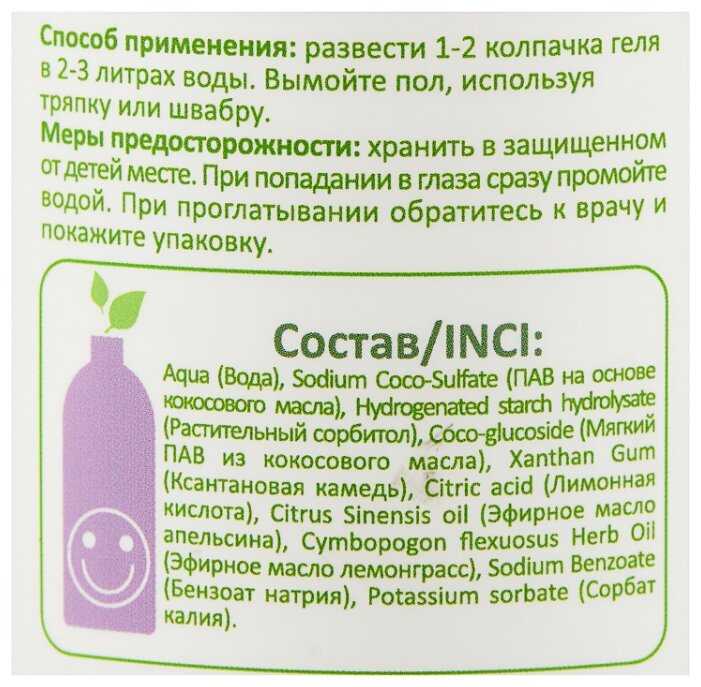Способ применения : | развести 1-2 колпачка геля в 2-3 литрах воды. Вымойте пол, используя тряпку или швабру |