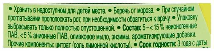 | Дополнительная информация : | эффективное удаление пятен с помощью цитрата соли лимонной кислоты, состав: 5- <15% неионогенные ПАВ <5% анионные ПАВ оливковое мыло энзимы ароматизирующие добавки, прочие компоненты: цитрат (соль лимонной кислоты) |