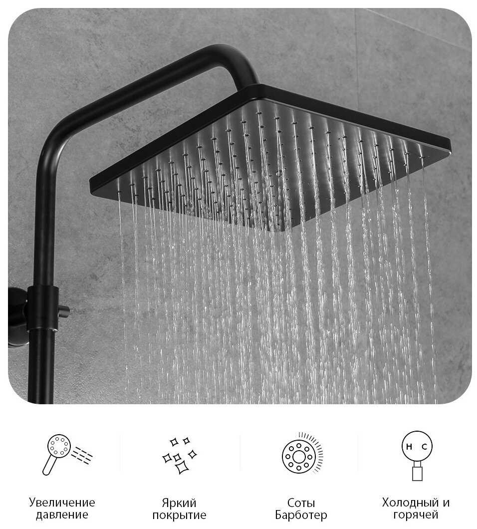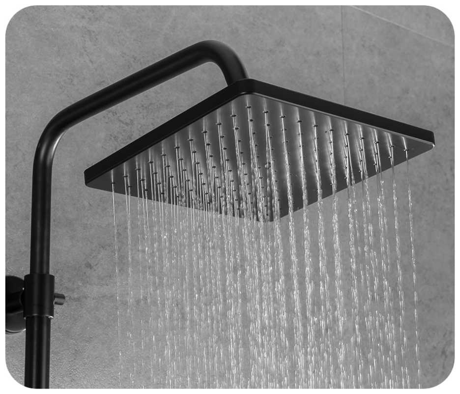 - + Очень хороший тропический душ!! Главное достоинство что он регулируется на рост человека 190см. Качественная сборка, очень красивый и удобный! Монтаж выполняется очень легко!!