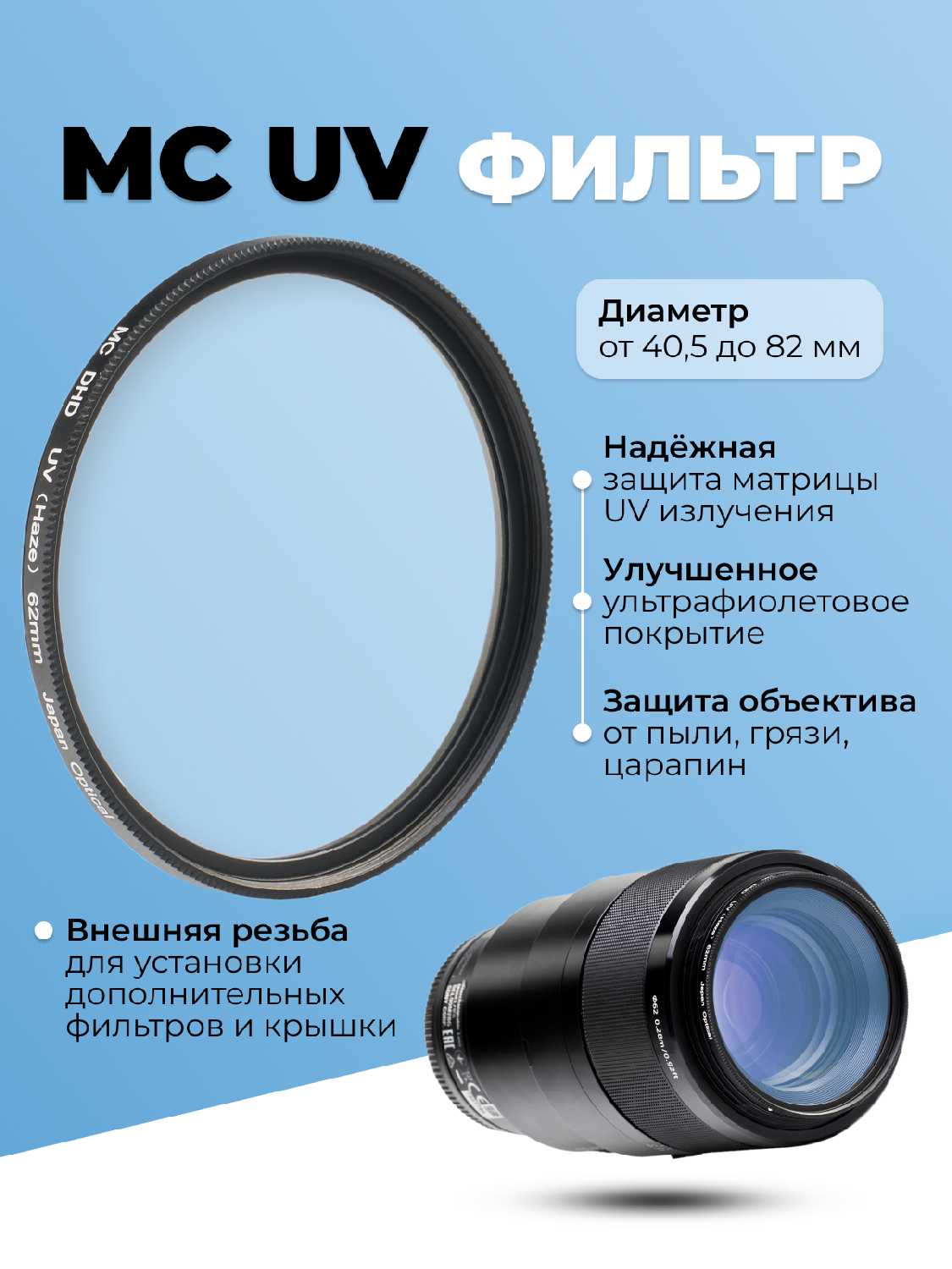 Дополнительная информация : | Останавливает ультрафиолет и ослабляет тепловые лучи, защищает объектив от влаги и грязи, пыли, механических воздействий. Не бликует |