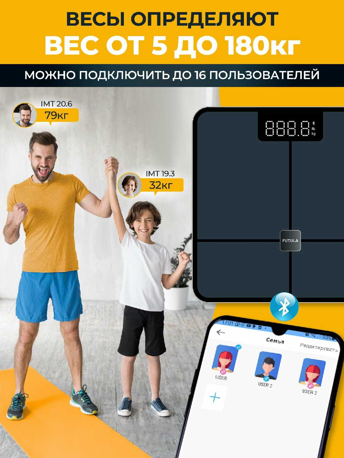 С подключением к приложению проблем не возникло, с настройкой пользователей тоже. Весы могут автоматически понимать кто встаёт на них (при использовании несколькими людьми). - - Иногда бывают ошибка определения кто встаёт на весы. Не знаю как точно это работает, но если идентификация идёт по весу человека, то понятно почему иногда происходит неправильное определение (почти одинаковый вес у двух разных людей). В этом случае достаточно зайти в приложение и нажать кнопку "взвеситься" у нужного человека.