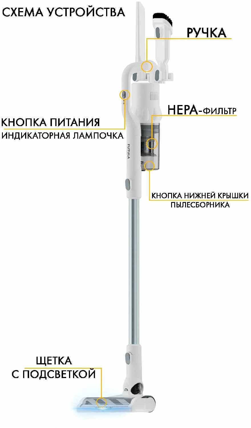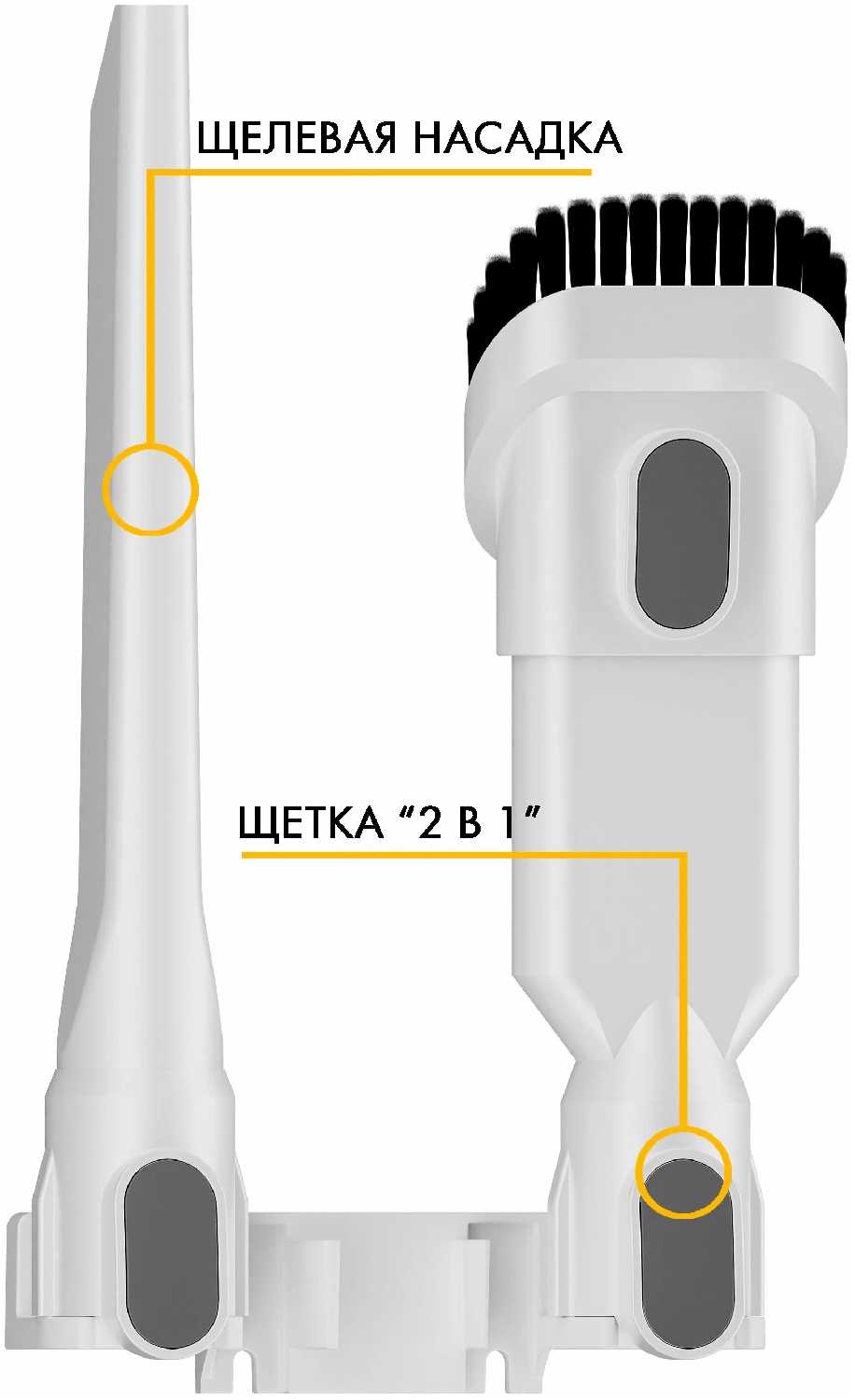 - Подсветка на основной насадке освещает затемнённые участки (под диванами, шкафами), повышая качество уборки.