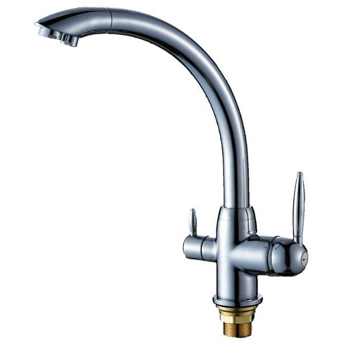 Продуманный смеситель для водопроводной и для очищенной воды. Его можно подключать к фильтру и из него будет течь питьевая вода. Для этого в кране есть два отверстия и два регулятора напора воды. Это находка для тех, кто использует дома фильтр. Теперь из раковины не будут торчать два крана, а будет лишь один многофункциональный.