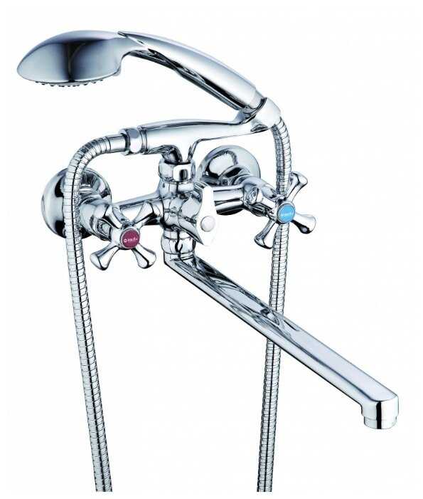 Изготовлен из традиционного для сантехники материала с хромированным покрытием, прочный и износостойкий. Не боится механических воздействий и моющих веществ. Запорная арматура у него керамическая, поэтому протечек у этого смесителя не бывает, а регулировка воды происходит легко и мягко. Излив у смесителя достаточно длинный, чтобы хватало на ванну и раковину.