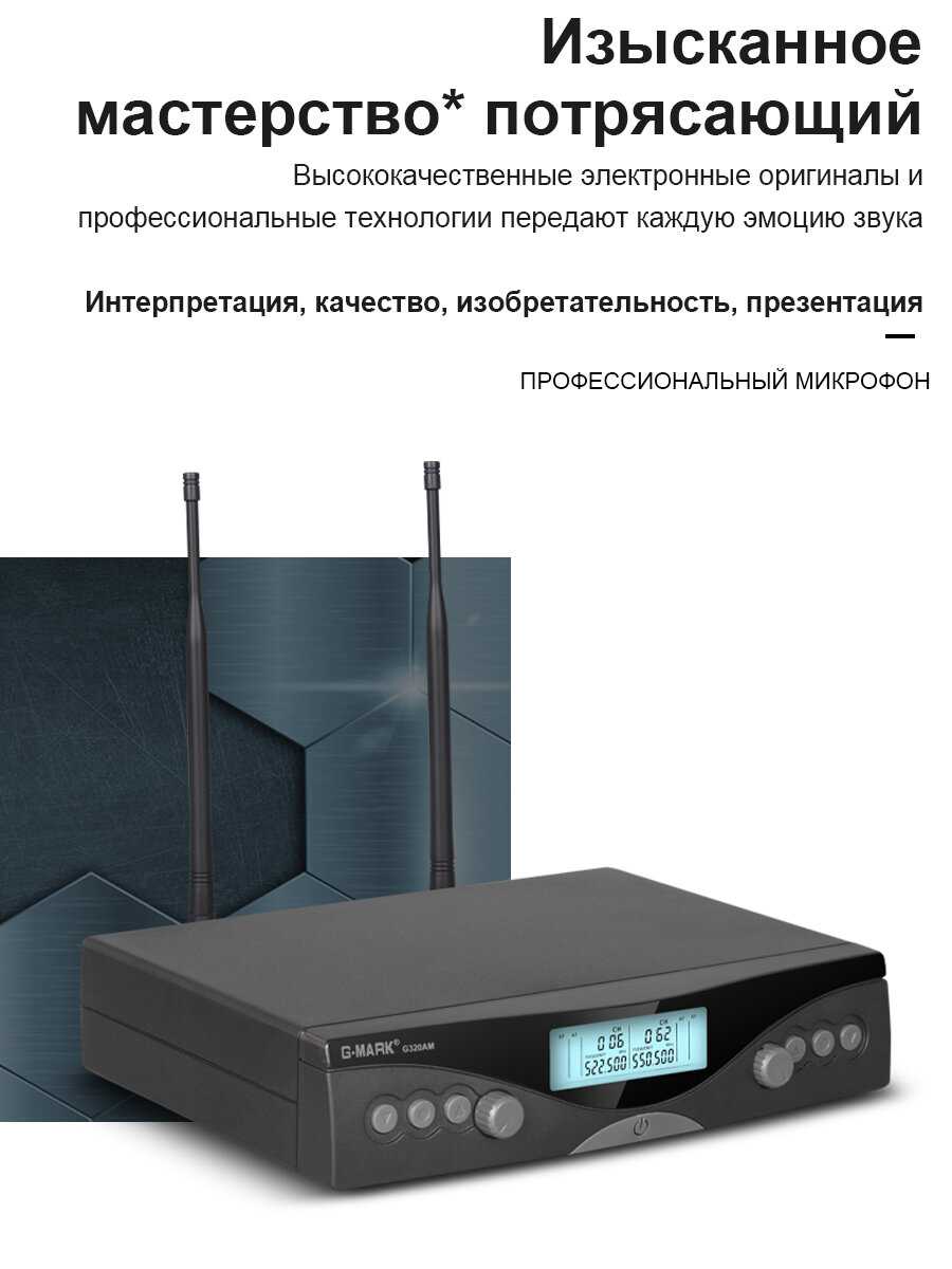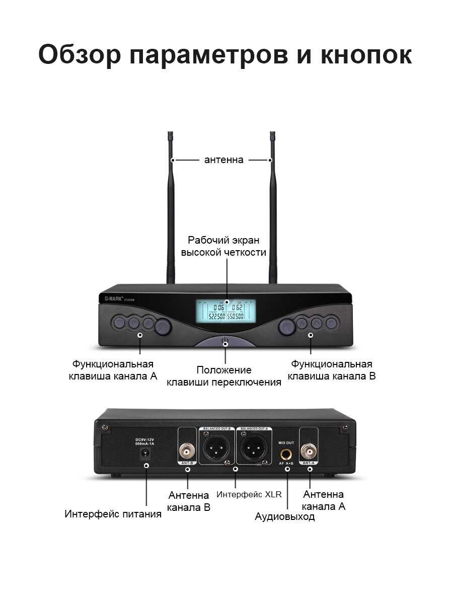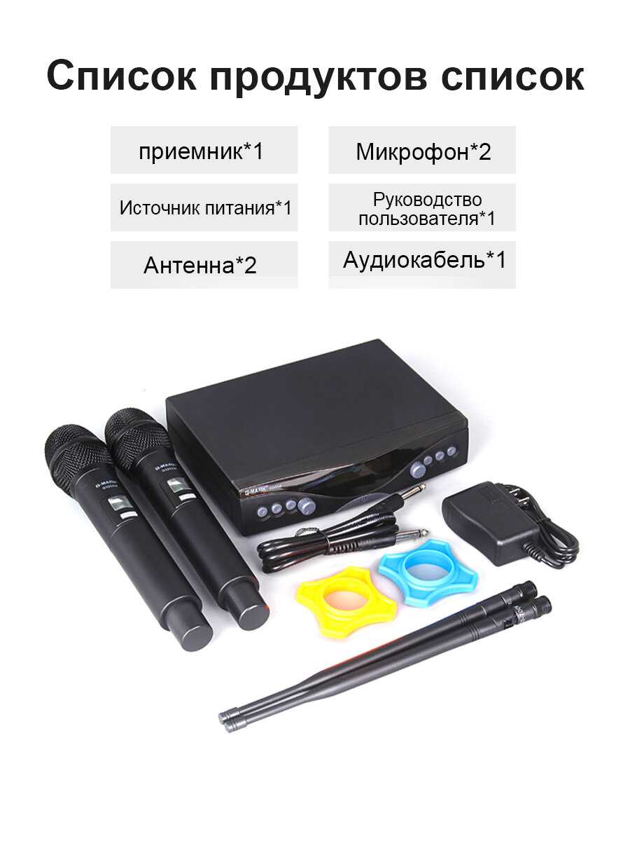 Подробная комплектация : | Приемник Два микрофона Две антенны Вилка питания Аудиокабель Два защитных кольца микрофона руководство по эксплуатации |
