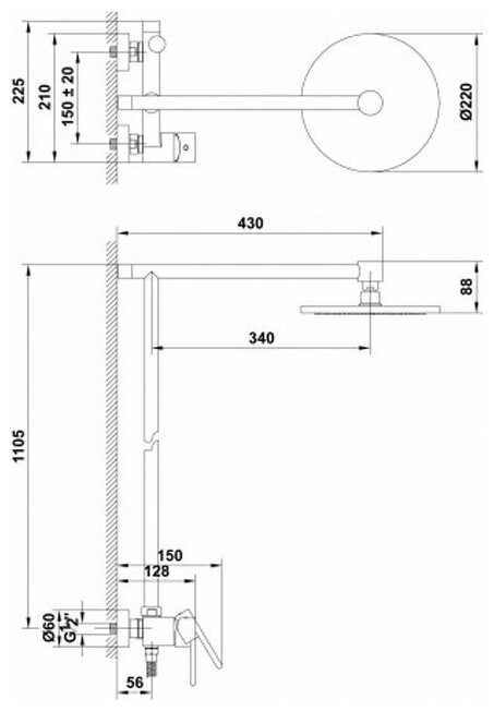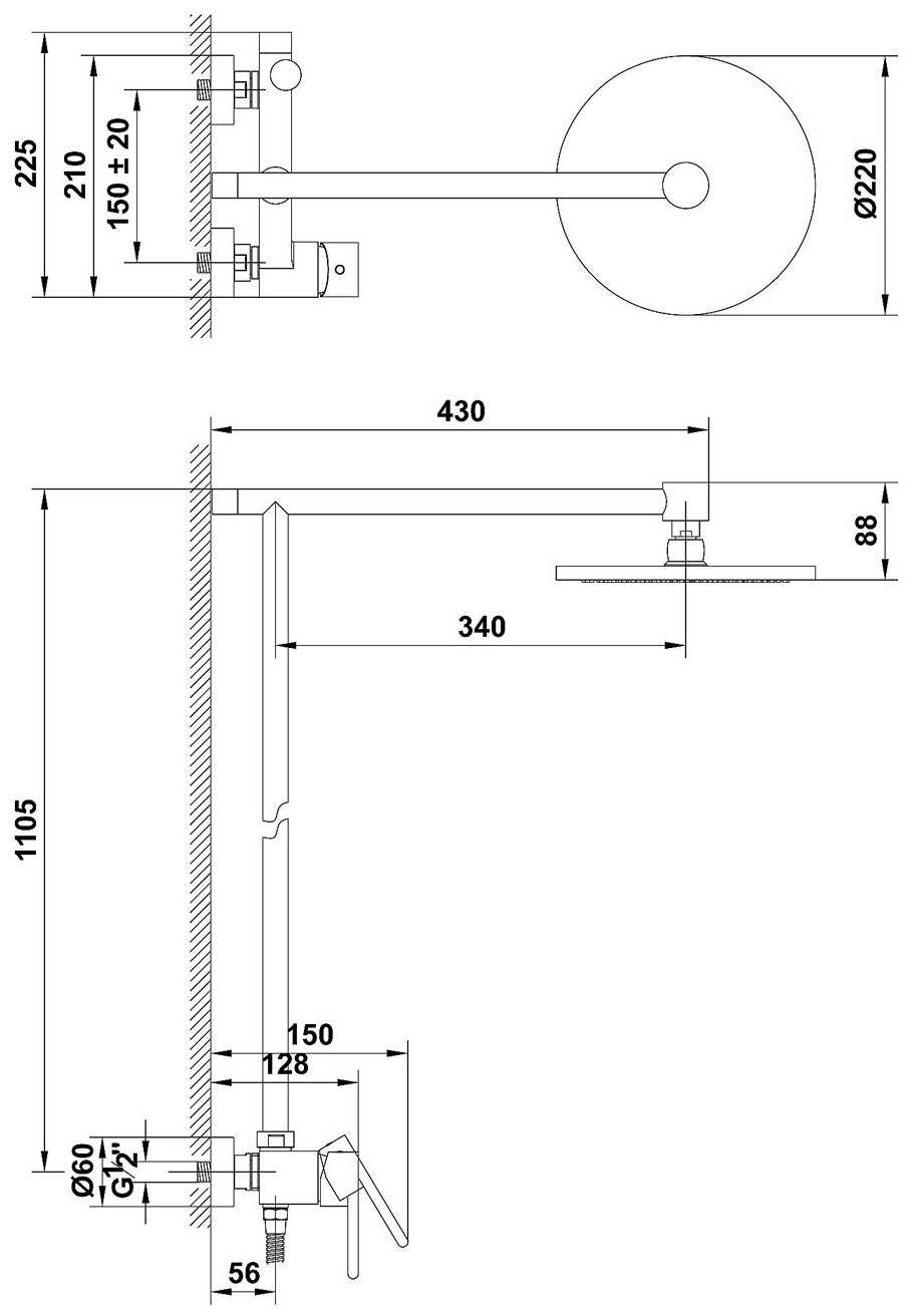 | Дополнительная информация : | высота стойки для душа: 1105 мм, диаметр верхнего душа: 220 мм |