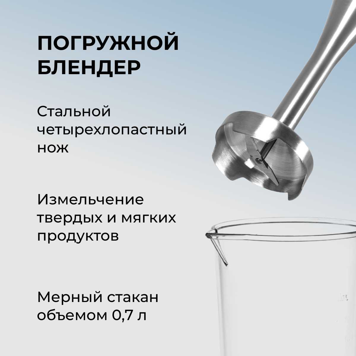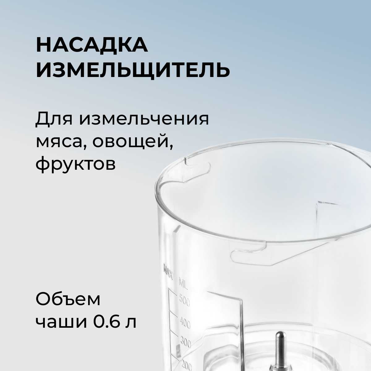 | Насадки : | венчик для взбивания, для замешивания теста, для приготовления пюре, измельчитель, мельничка |