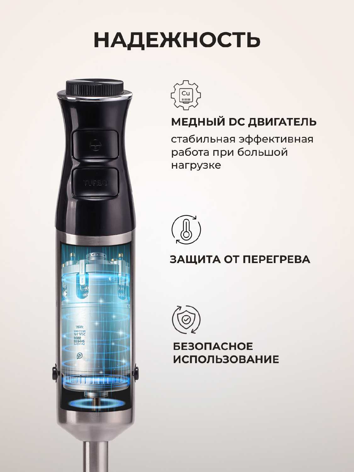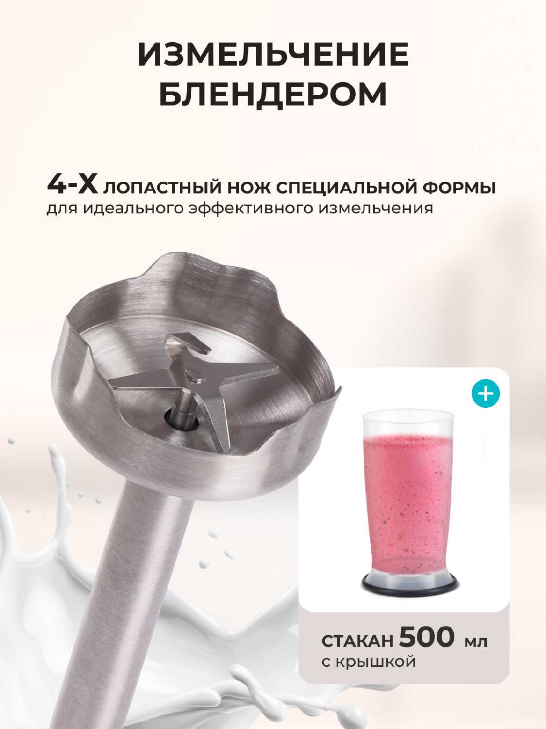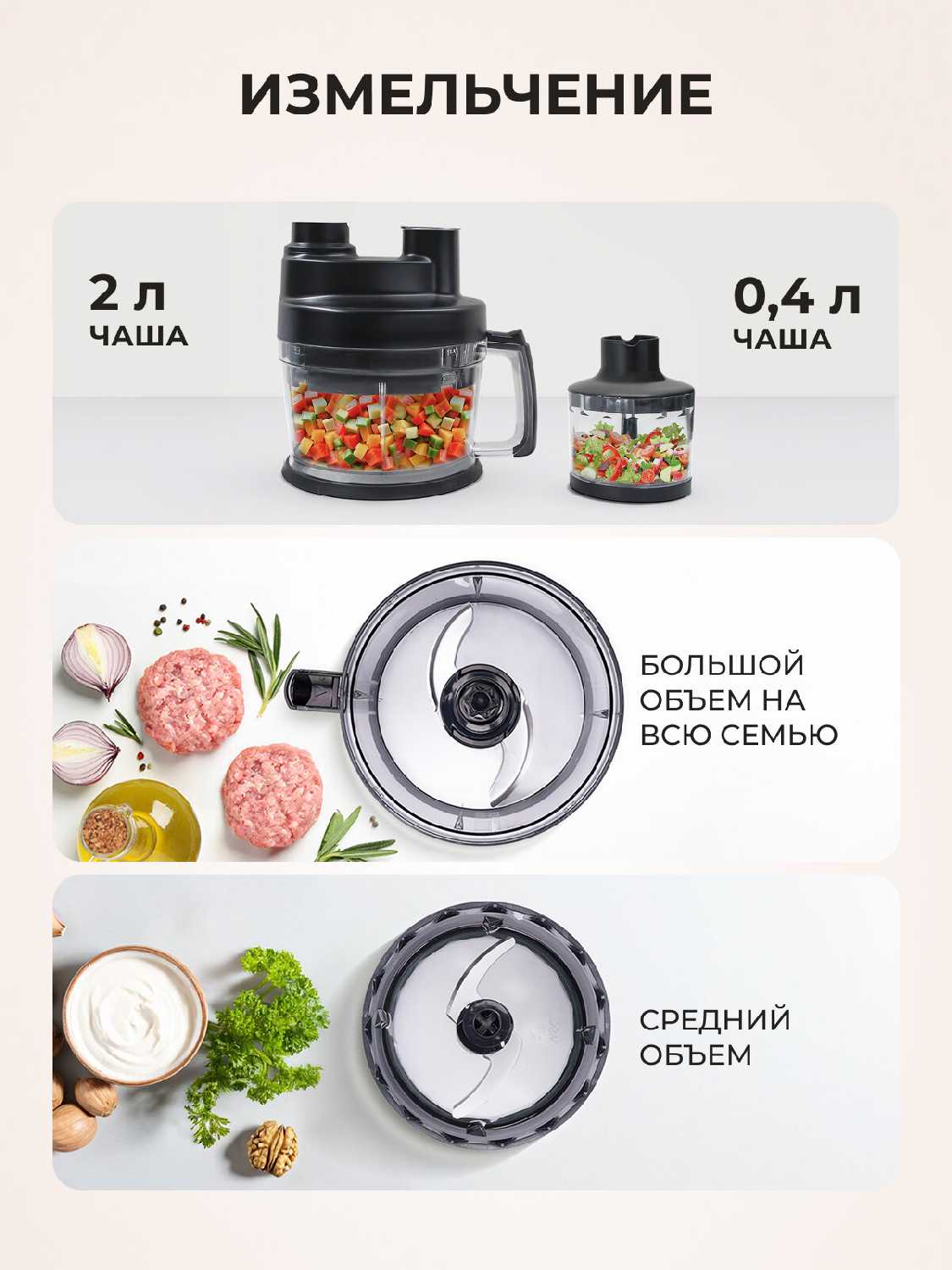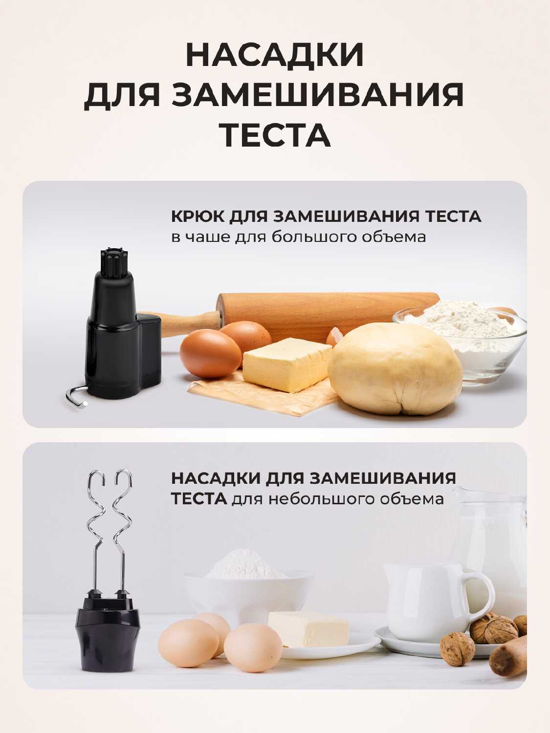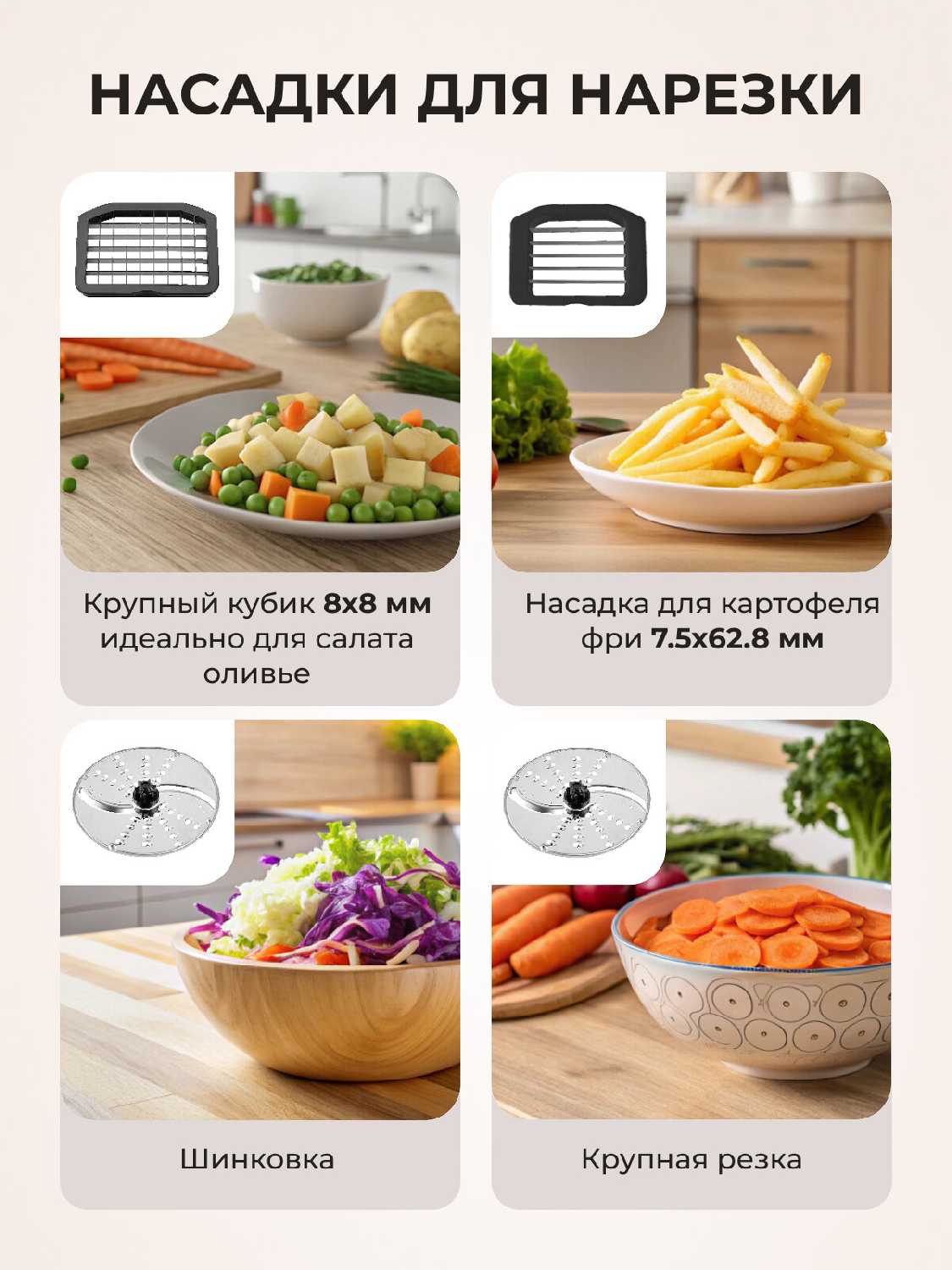 Насадки : | венчик для взбивания, диск для нарезки ломтиками, для замешивания теста, для нарезки кубиками, для приготовления пюре, насадка для шинковки |