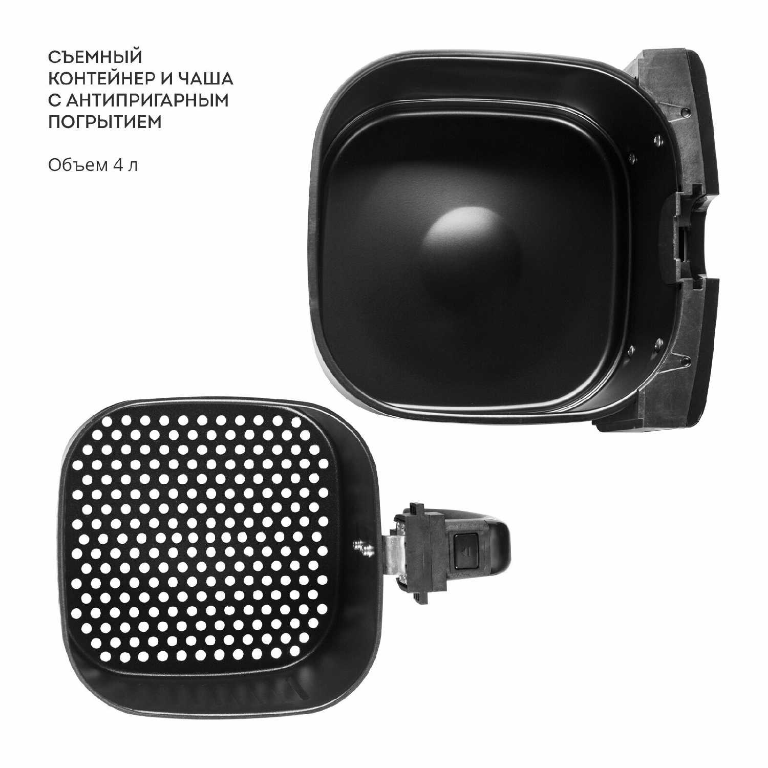- Технология позволяет готовить картофель фри, наггетсы и котлеты с хрустящей корочкой без добавления масла.