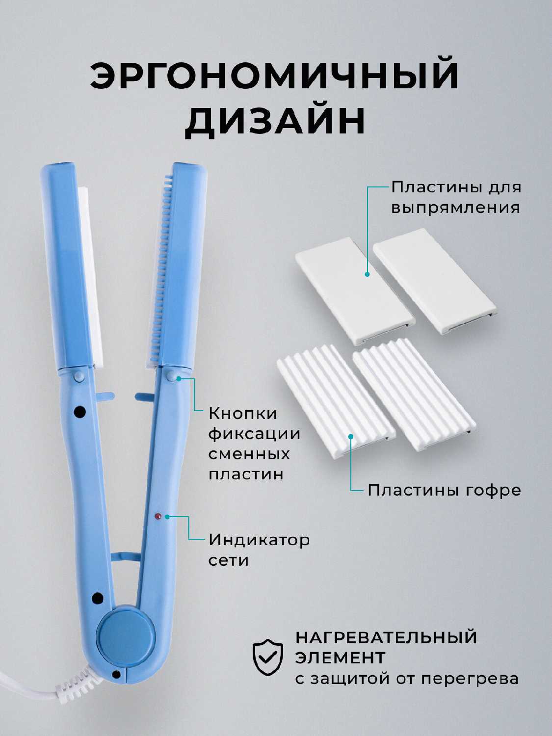 | Особенности : | вращение шнура, дисплей, индикация включения, индикация готовности к работе, ненагревающийся наконечник, петля для подвешивания, плавающие пластины |