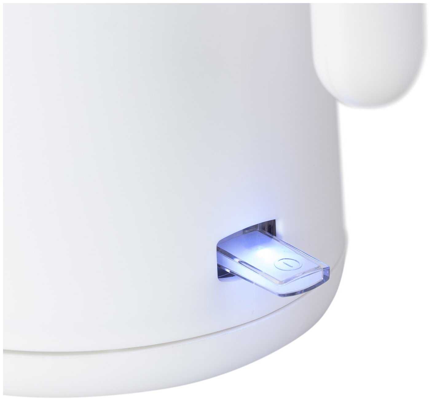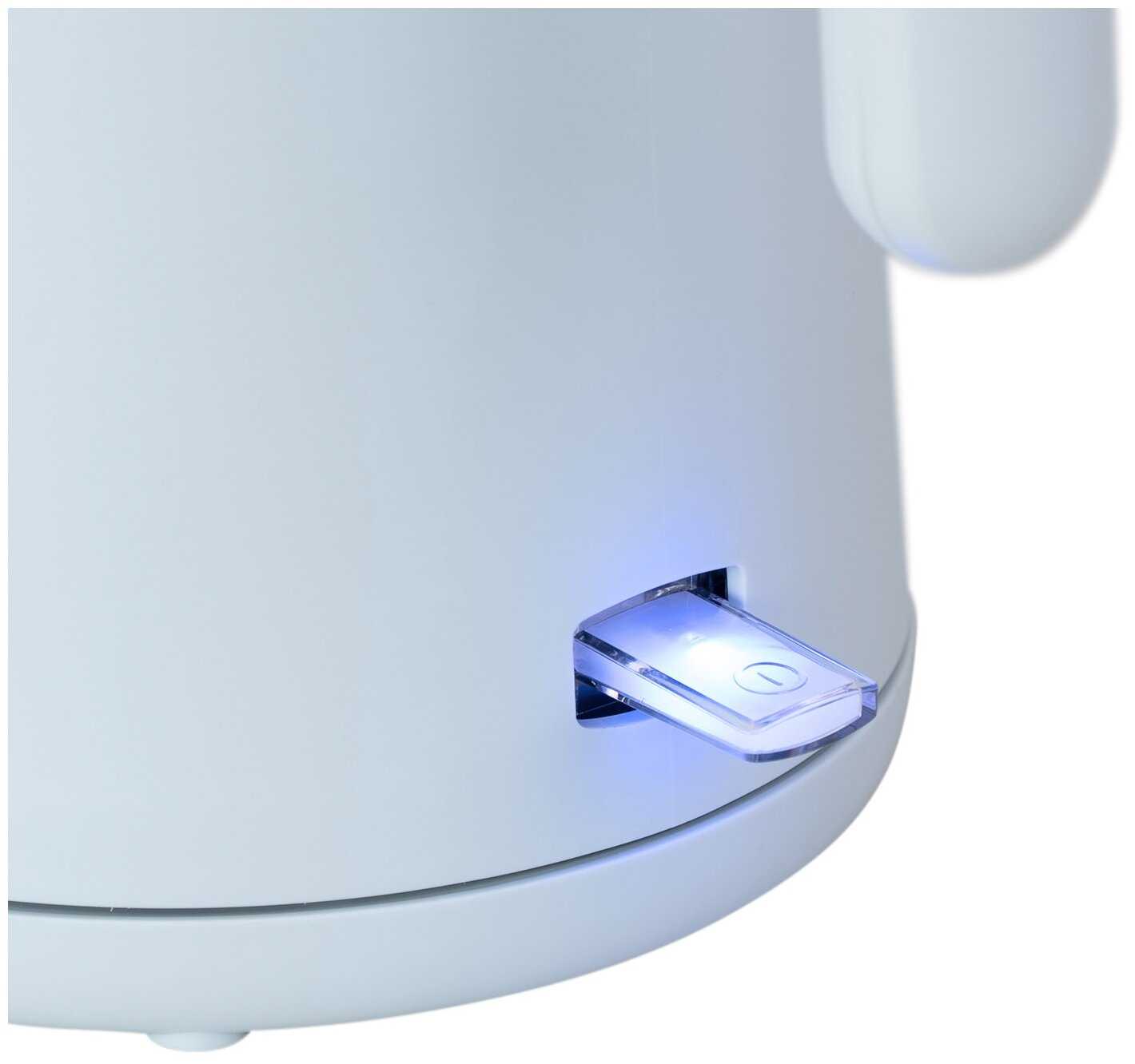 Хорошо сбалансированный чайник с интересным дизайном. -Кнопка включения туговата, в магазине даже из-за своей деликатности, с первого раза не смог включить. Синие окошки и густая синяя подсветка - уровень воды виден слабее, чем на старом чайнике с прозрачными окошками.