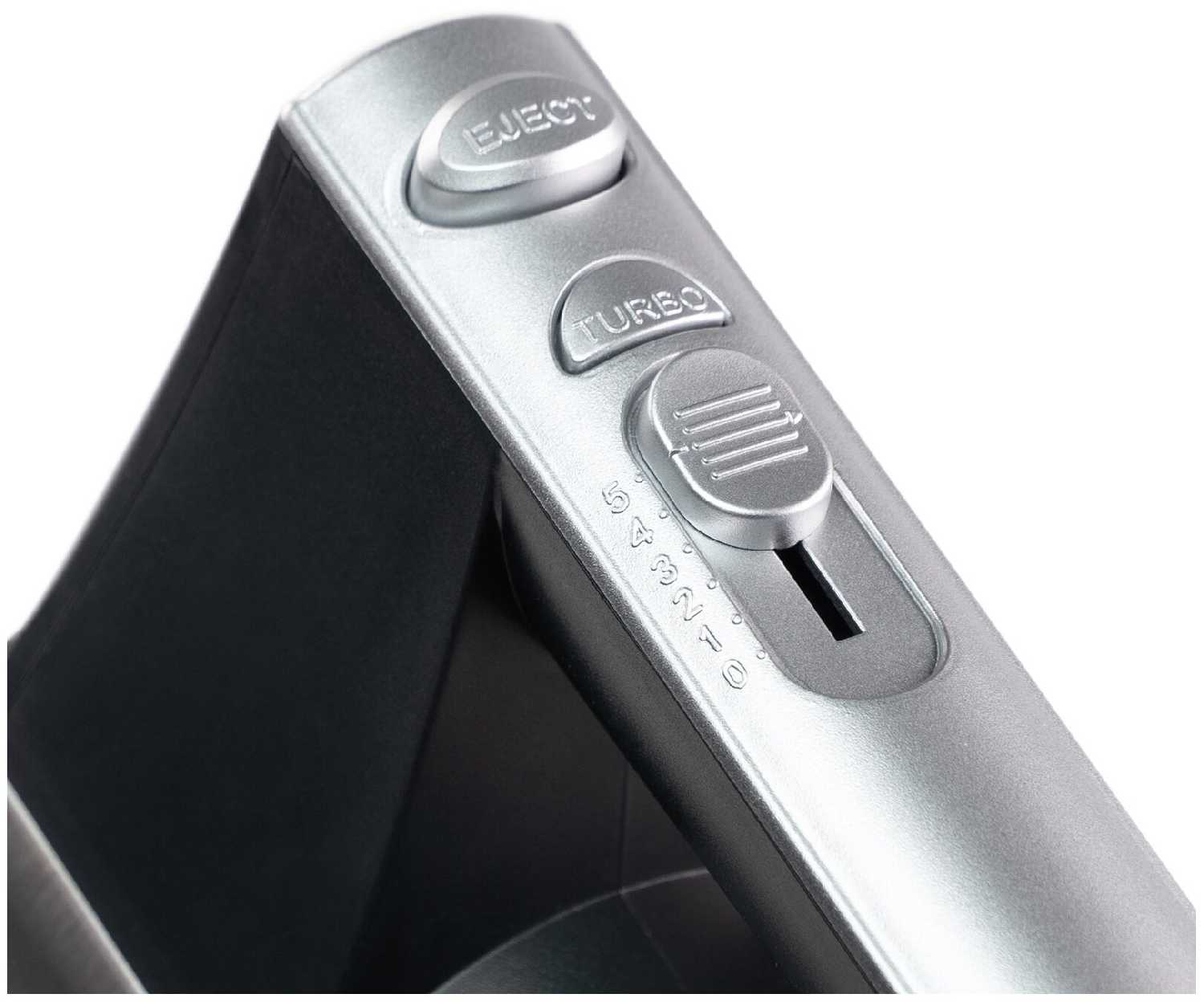 - Пять скоростей с регулировкой на ручке обеспечивают гибкость для разных задач, от легкого взбивания до интенсивного (плавное переключение в большинстве случаев).