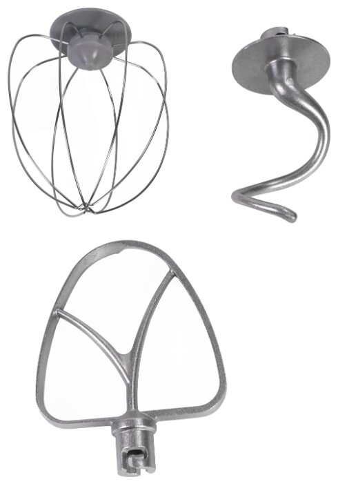 - Основные насадки (крюк для теста, венчик, лопатка) выполнены из металла, что повышает их износостойкость.