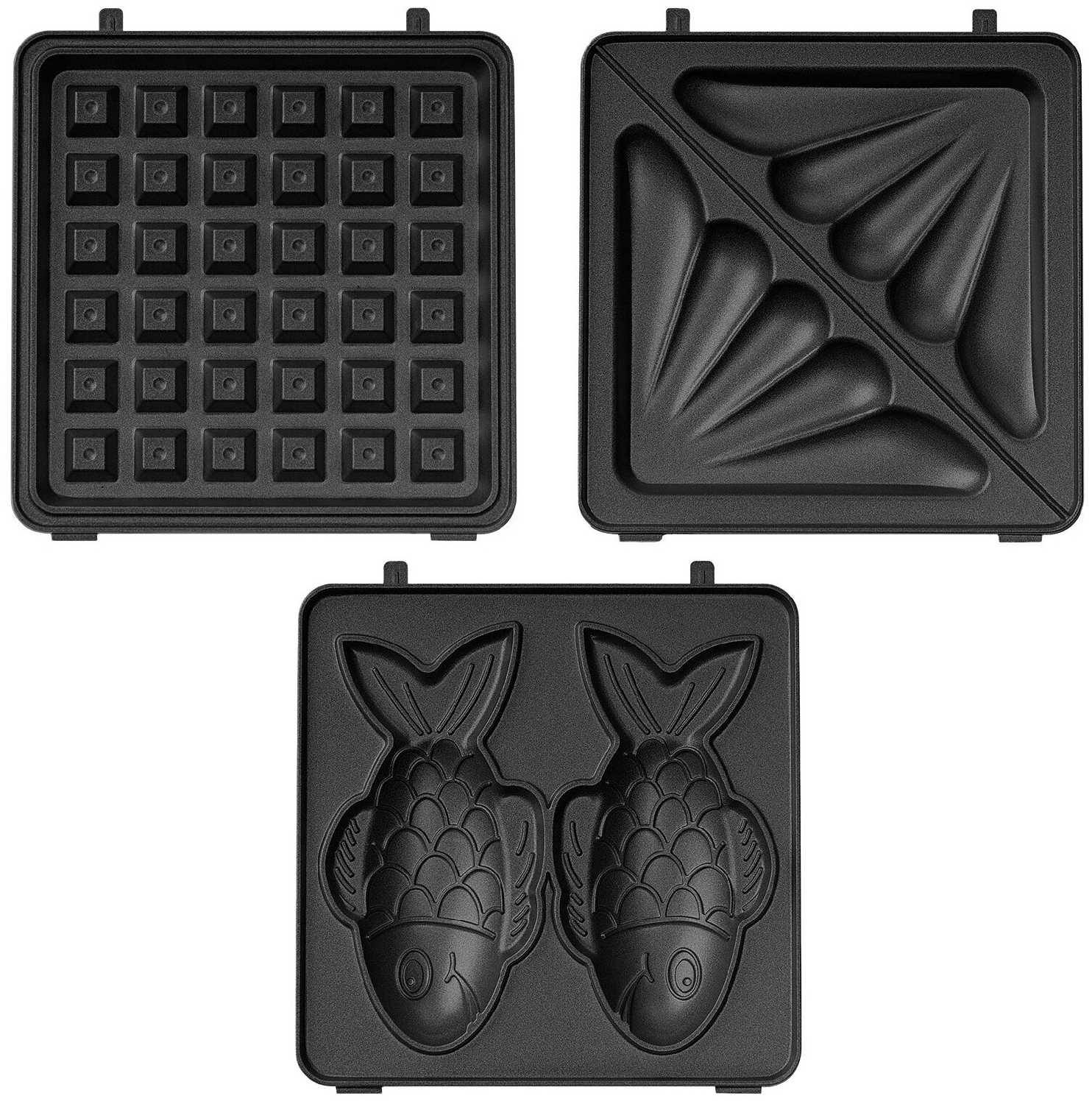 - В комплекте три пары панелей для вафель, пончиков и сендвичей-гриля, которые легко снимаются и надежно фиксируются.