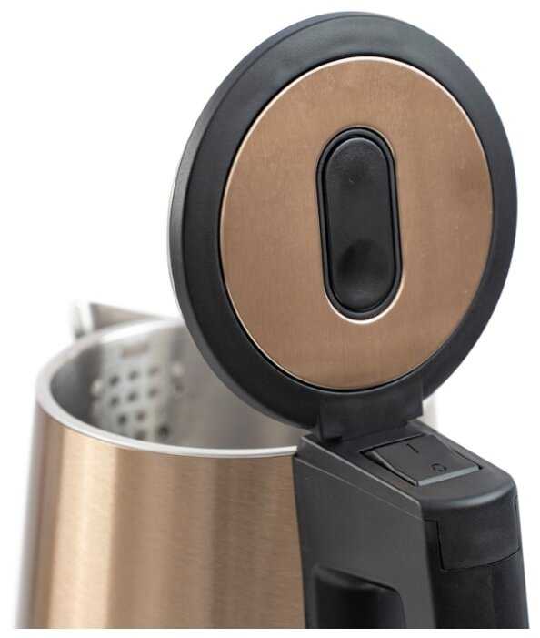 5. В отличие от почти любого другого бюджетного электрочайника, у этой модели кнопка включения находится сверху ручки, а не снизу. Механизм автовыключения обычный, но пар поступает непосредственно к датчику через отверстие сверху корпуса, а не опускается по трубке куда-то на дно. Такую кнопку значительно сложнее сломать и гораздо проще отремонтировать при поломке, чайник прослужит дольше.