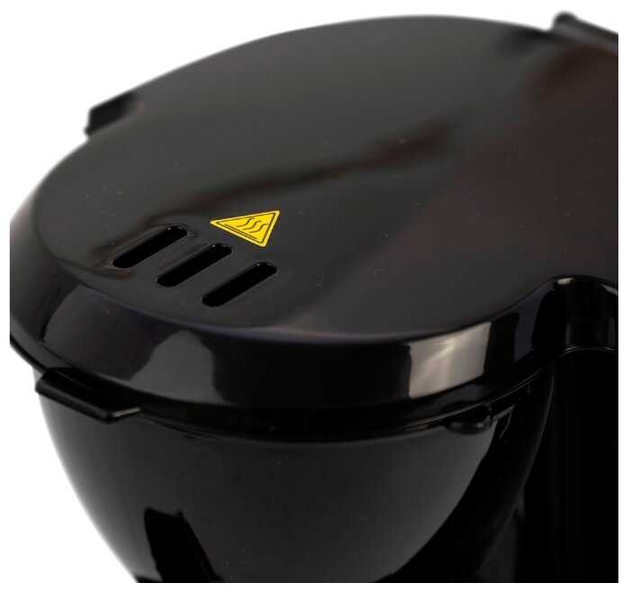 - Кнопка включения жёсткая, нужно придерживать рукой; кувшин цепляется за антикапельный клапан, приходится фиксировать кофеварку.