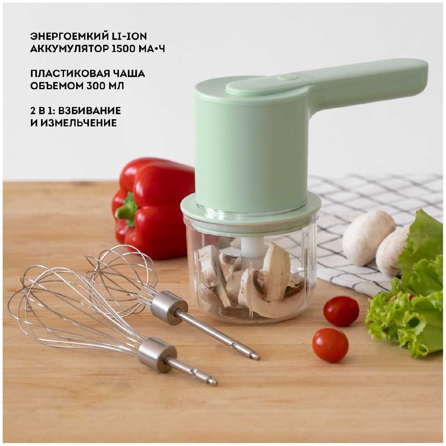 Удобный. Малый объем. Измельчитель + насадки - венчики для взбивания.