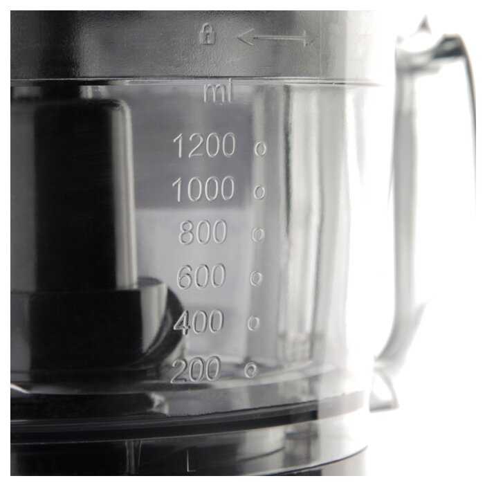 - Высокие стенки загрузочного отсека (8 см) и пестик в комплекте исключают контакт рук с лезвиями.