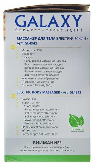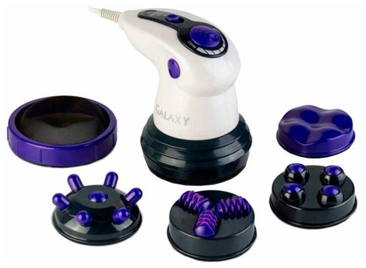 Купила себе и маме. Раньше был подобный слим фит, лет 5 проработал. В принципе Galaxi не плохой. Но, в сравнении с прежним, слабоват. Вибрация слабенькая ( амплитуда вращения очень маленькая), скорость вращения можно добавить , но это особо не влияет на интенсивность массажа, насадки спадают. За полгода использования на одной насадке выпал ролик. Шнур достаточной длины. К ручке приноровится можно, дело привычки, хотя коротковата и не очень удобно держать. И еще один минусовой момент - при работе массажера помехи на телевизор и компьютер жуткие. Вообщем не могу сказать, что совсем плохой, так среднячок.