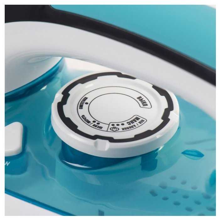 - Терморегулятор с тремя режимами (синтетика, шерсть, хлопок) сохраняет настройки после отключения.
