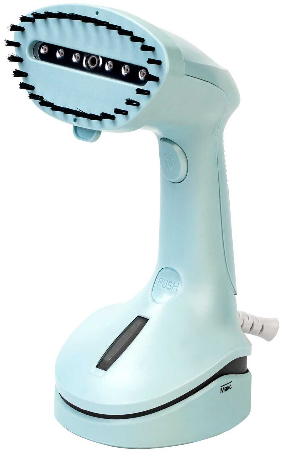 - + Мощный отпариватель, полного бака(200мл) хватает на ~10мин, и за это время можно отпарить много вещей, длинный провод радует, в комплекте шли 2насадки для деликатных тканей и щеточка, мешок для хранения, куда помещается весь комплект