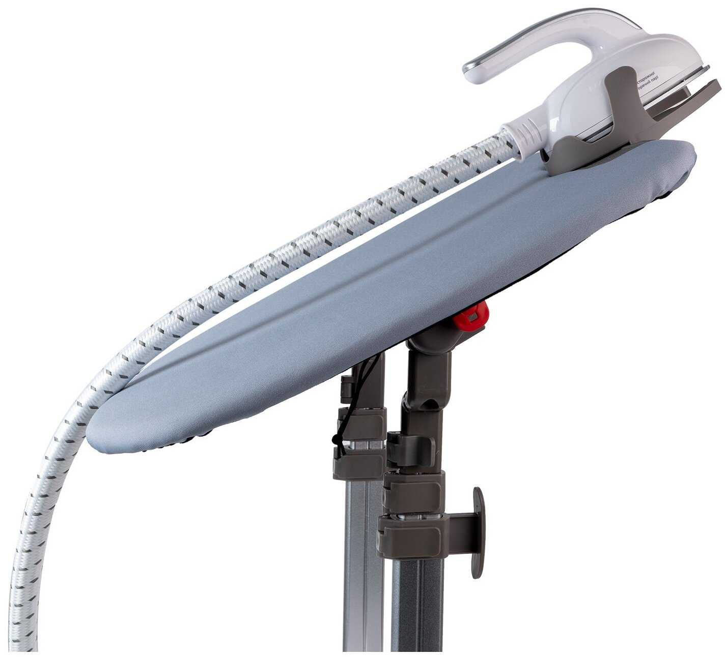 1. крепление для утюжка расположено вверху доски (плечиков) - т.е., одной рукой держа утюжок с постоянной подачей пара, второй как-то надо ухитриться аккуратно развесить одежду на доске. Или закрепить утюжок с проводом на площади доски и на нее же повесить одежду. Как??