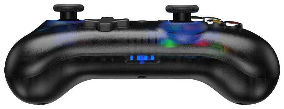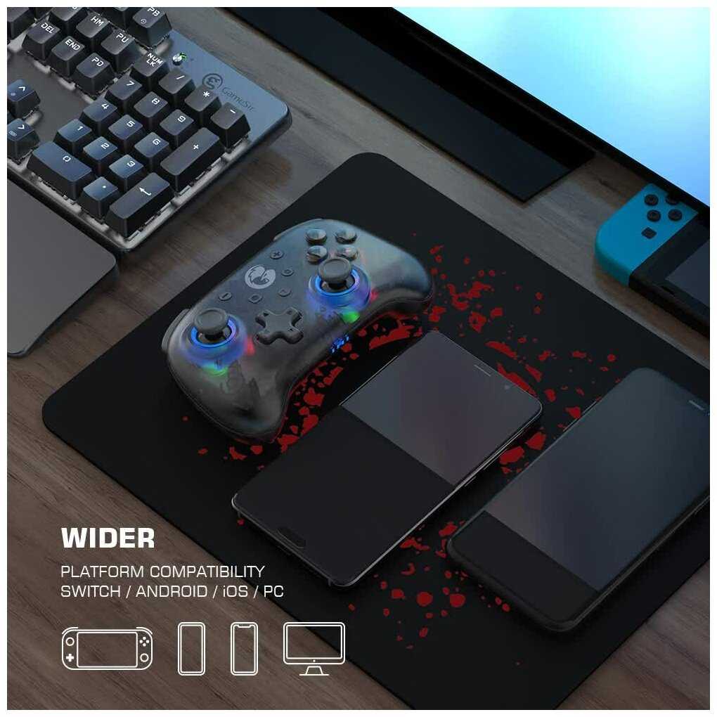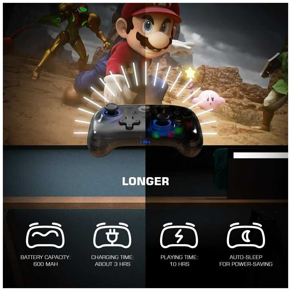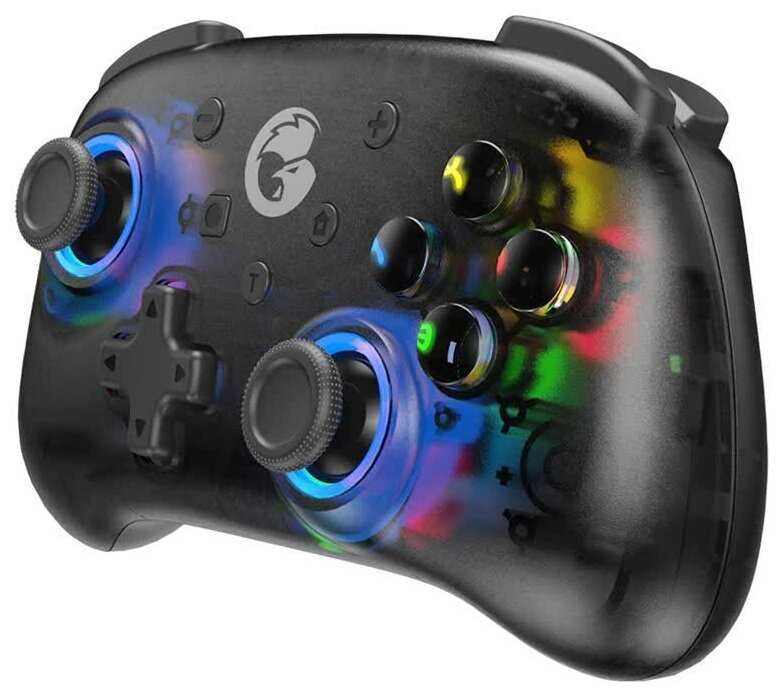 - + удобный, чуткие стики, есть адекватный гироскоп, typec зарядка, симпатичный, есть быстрая регулировка вибрации и подсветки ( можно выключить или поменять цвета ) , с Нинтендо свитч работает отлично.