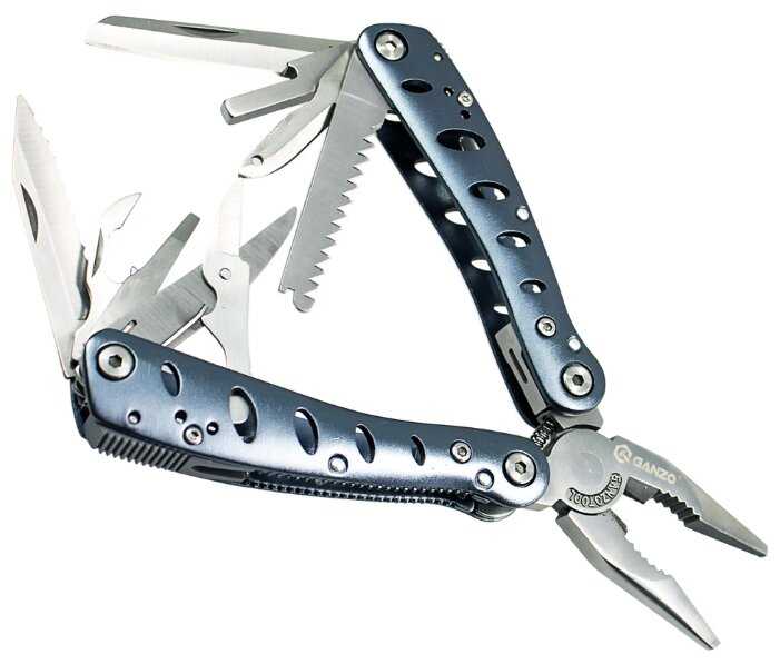 Инструменты (функции) : | кусачки плоскогубцы маленькая отвертка плоская крестообразная отвертка нож нож с зубчатым лезвием ножницы открывалка для бутылок консервный нож инструмент для снятия изоляции пила шило держатель бит 10 сменных насадок |