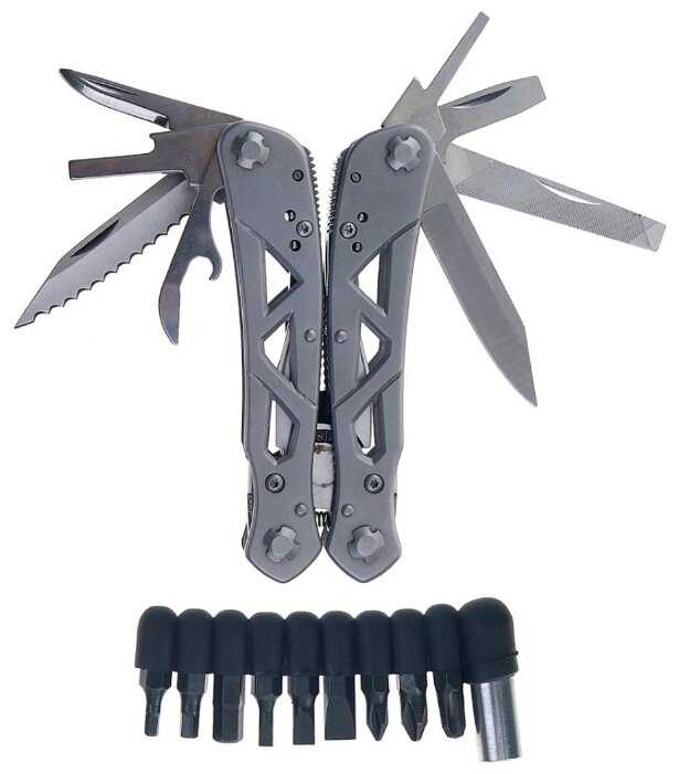 | Дополнительная информация : | количество инструментов (функций): 13, материал инструмента: нержавеющая сталь, количество бит: 9 шт., инструменты (функции) подробно: плоскогубцы кусачки нож с прямой кромкой нож с серрейторной кромкой шило линейка открывалка для банок и бутылок крестовидная отвертка две плоских отвертки 9 сменных насадок переходник для насадок, наконечники отвёрток / ключей: плоский (SL) крестовой (PH) |