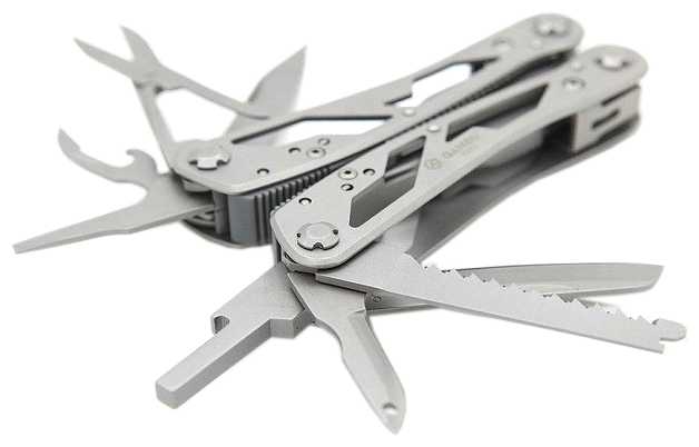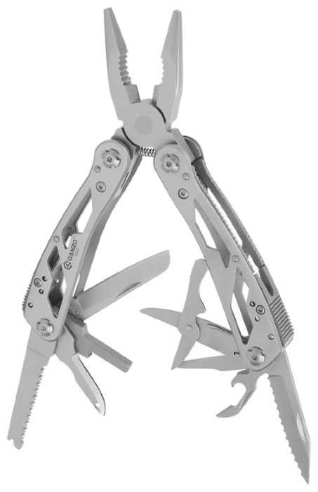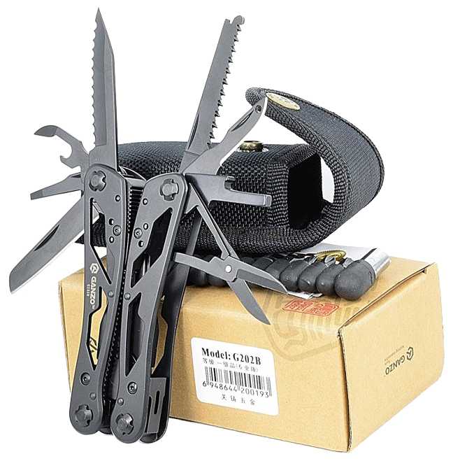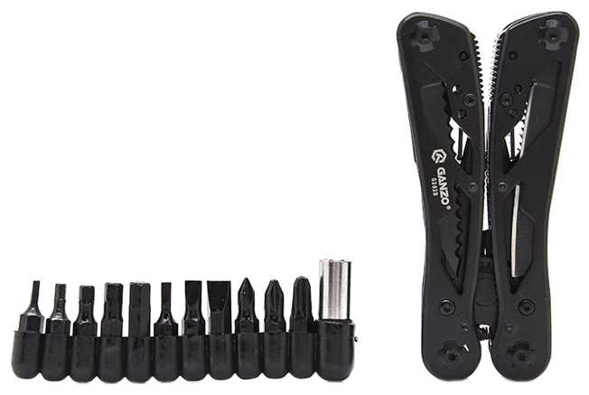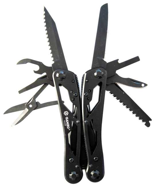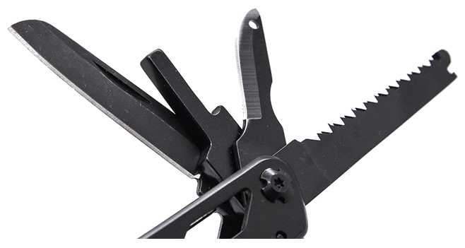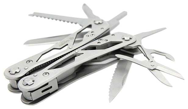 | Инструменты (функции) : | гаечный ключ, захват для гаек, консервный нож, кусачки, линейка, нож, ножницы, огниво, острогубцы, отвертка, открывалка для бутылок, пассатижи, пила, пилка для ногтей, плоскогубцы, сменные биты, шило / кернер |