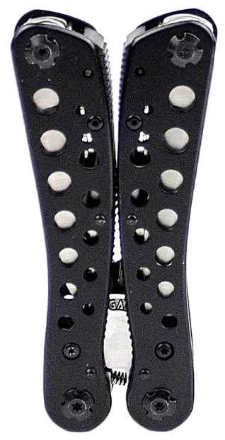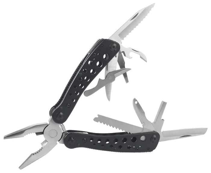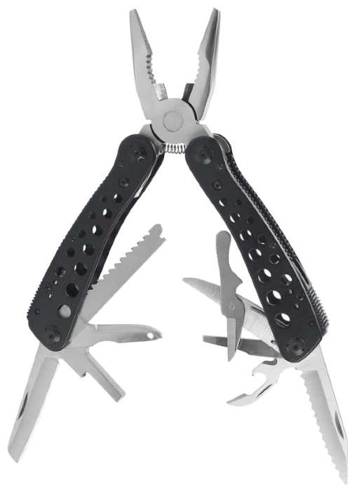 | Инструменты (функции) : | гаечный ключ, консервный нож, кусачки, нож, ножницы, острогубцы, отвертка, открывалка для бутылок, пассатижи, пила, плоскогубцы, сменные биты, шило / кернер |