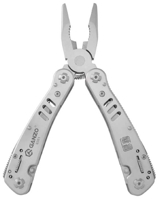 Инструменты (функции) : | плоскогубцы кусачки маленькая отвертка плоская нож серрейтор консервный нож открывалка для бутылок инструмент для снятии изоляции пила захват для гаек и цилиндров ножницы шило кольцо для подвеса держатель бит 12 сменных бит |