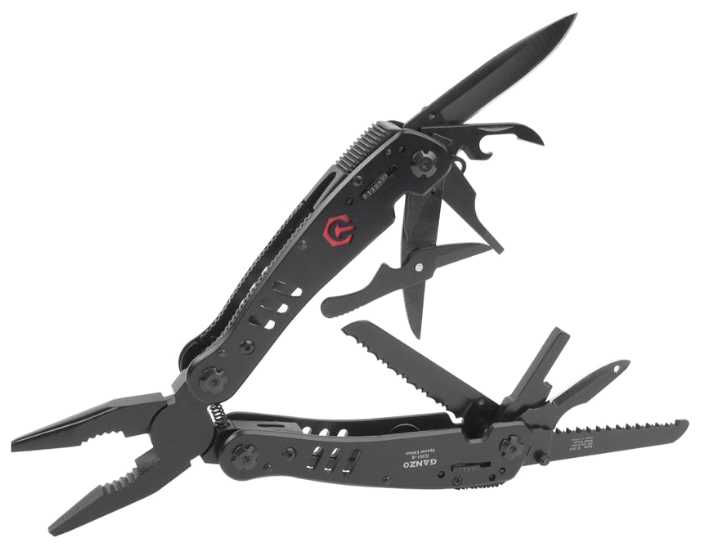 | Инструменты (функции) : | захват для гаек, консервный нож, кусачки, нож, ножницы, острогубцы, отвертка, открывалка для бутылок, пассатижи, пила, пилка для ногтей, плоскогубцы, сменные биты, шило / кернер |