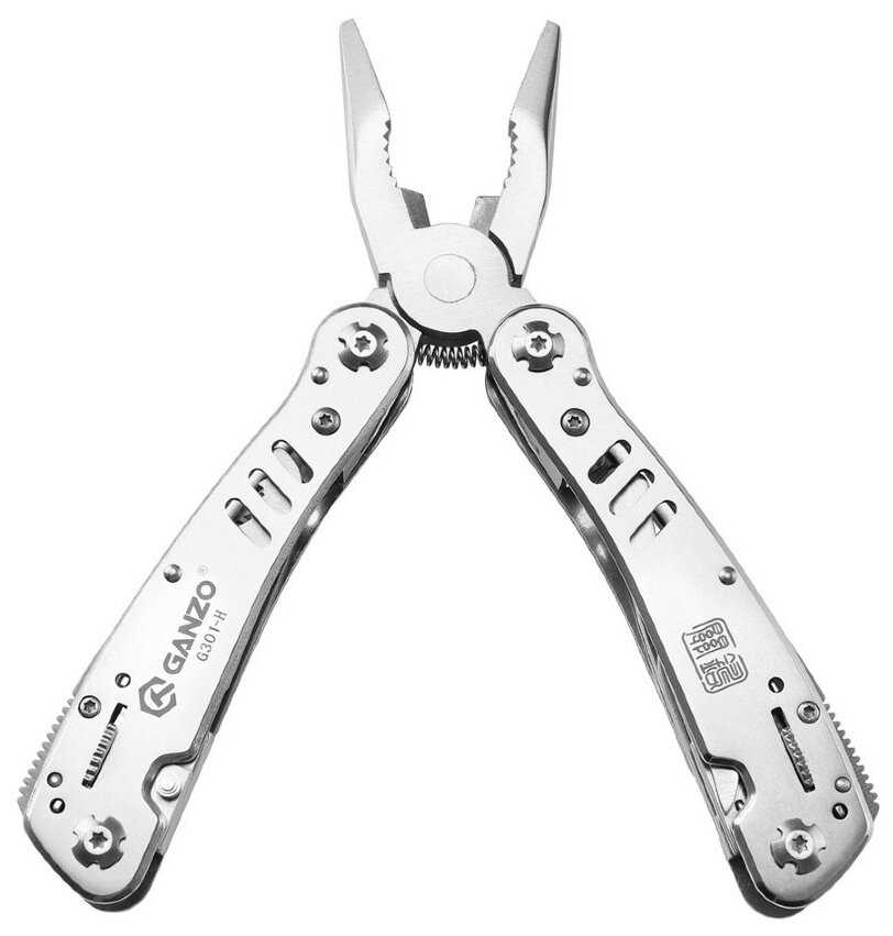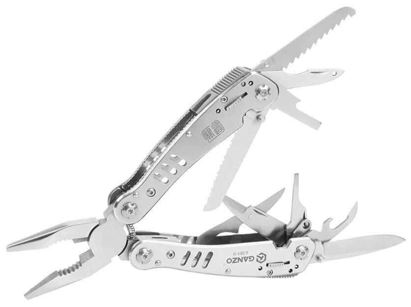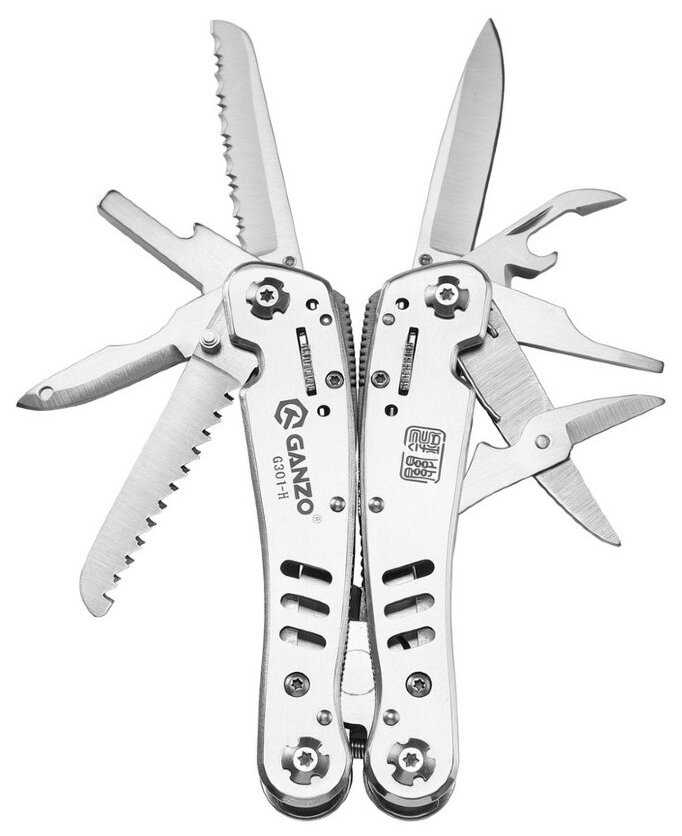 | Инструменты (функции) : | захват для гаек, консервный нож, кусачки, линейка, напильник, нож, ножницы, острогубцы, отвертка, открывалка для бутылок, пассатижи, пила, пилка для ногтей, пинцет, плоскогубцы, сменные биты, шило / кернер |