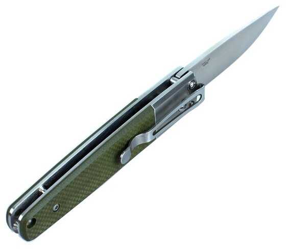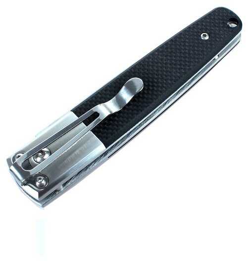 - Глубокий карабин с пружиной из стали 301 утапливает нож в кармане на 85%.