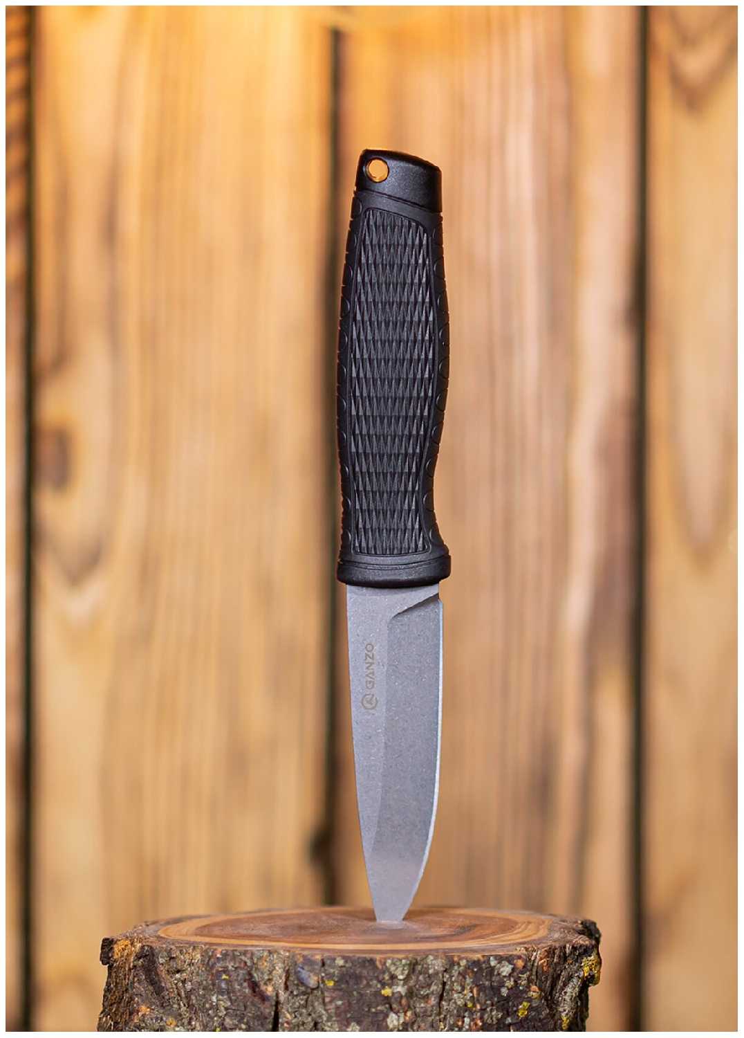 Прямые спуски при толстом обухе (около 3 мм) в сочетании с правильным сведением режущей кромки обеспечивают контролируемый и предсказуемый рез. В отличие от скандинавской геометрии Mora, которая склонна раскалывать продукты или неожиданно уходить глубоко в материал, клинок Ganzo режет чисто и уверенно, особенно заметно при работе с едой. Это исключает риск неконтролируемого выхода острия. -