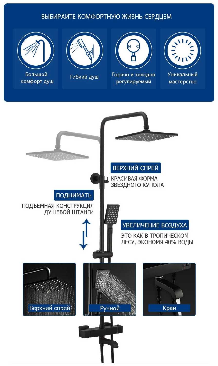 Эргономика системы вызывает смешанные реакции. С одной стороны, интуитивное управление, удобные режимы душа и отсутствие необходимости в тонкой настройке нравятся большинству. С другой — высота тропического душа в 1 метр делает его бесполезным для взрослых выше 175 см. Это архитектурный просчет, который можно исправить лишь дополнительными затратами на удлинитель. Также раздражает отсутствие держателя лейки в некоторых комплектациях — факт, который стоит проверять сразу при получении товара.