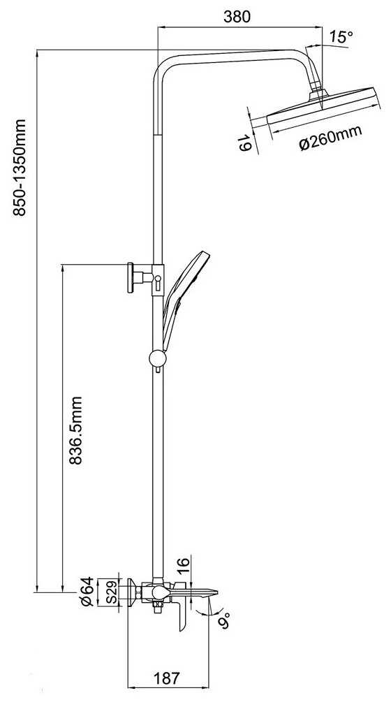 | Дополнительная информация : | высота стойки для душа 850-1350 мм, диаметр верхнего душа 260 мм |