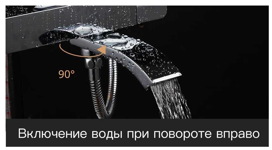 - Поворотный механизм позволяет мгновенно переключать поток между тропической лейкой, ручным душем и изливом.