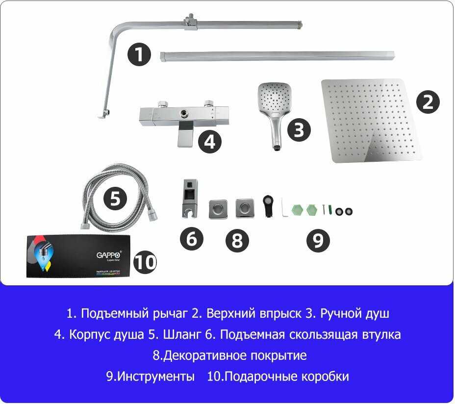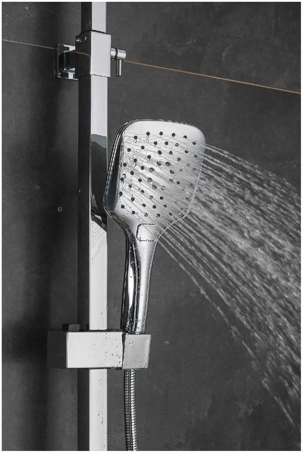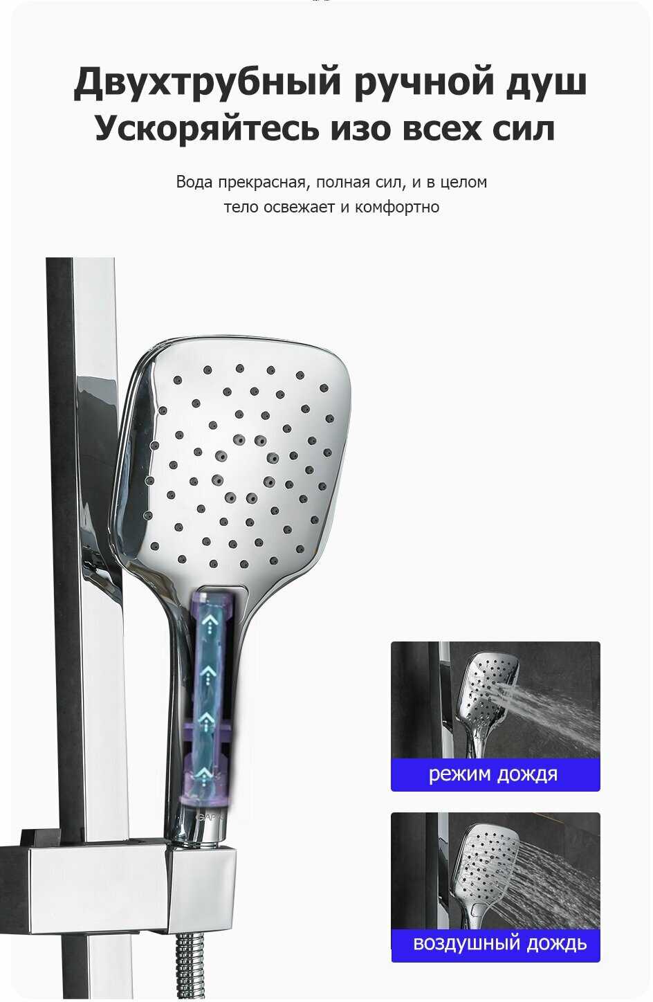 Комплектация : | верхний душ, душевая штанга, излив для набора воды, лейка, ручной душ, смеситель, шланг |