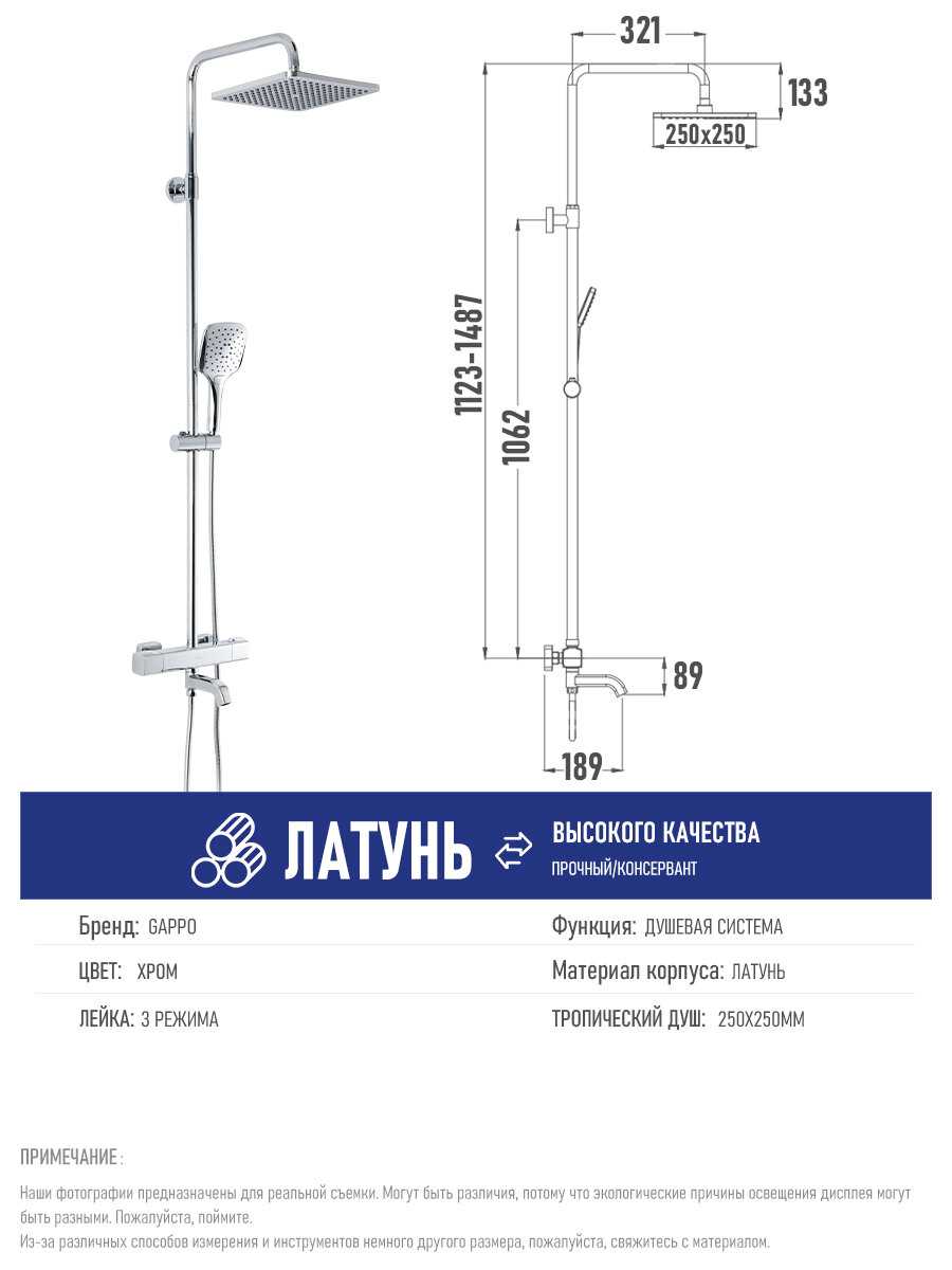 | Дополнительная информация : | высота стойки для душа: 1450 мм, длина верхнего душа: 250 мм, ширина верхнего душа: 250 мм |