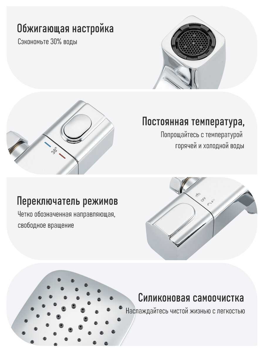 Эргономика и эксплуатационные ограничения: Управление и комфорт: Регулировка высоты верхней лейки возможна, но крепление ручной лейки в держателе излишне тугое, затрудняющее извлечение одной рукой. Напор воды снижен на 30-40% по сравнению с обычными смесителями из-за аэраторов и конструкции термостата. Тропический душ обеспечивает равномерное распыление, но после отключения продолжает подкапывать до 2 часов. Кнопка переключения режимов на лейке подвержена заеданию, а ручка температуры имеет люфт в креплении. Пластиковые детали (лейки, ограничители) визуально воспринимаются как менее качественные на фоне металлического корпуса.