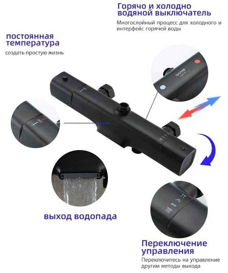 Температуру держит отлично. Выставил 38 градусов и на выходе ровный поток воды стабильной температуры, не шумит. Тропический душ 🔥 отдельная лейка не уступает, классные режимы с удобным переключением. - - Нет инструкции нормальной по сборке. Стойка состоит из трех трубок, третью в упаковке не так просто обнаружить, она спрятана под слоем полиэтилена черного. Спасибо поставщику за подсказку 👍🏻