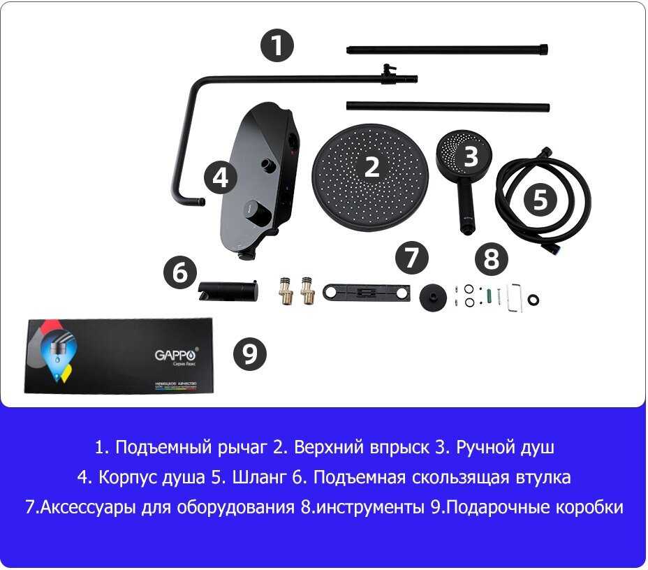 - + качество сборки, материалы, лёгкость установки, есть удобная мини полка, регулировка высоты стойки лейки