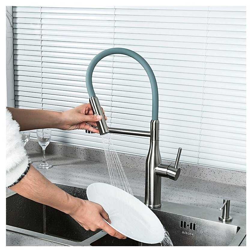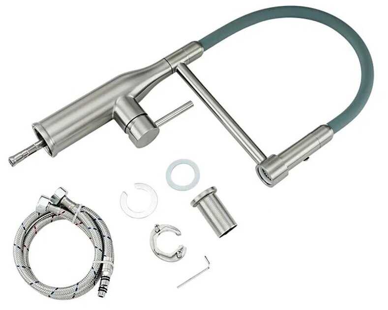 Удобный смеситель для кухни. Шланг мягкий, легко вынуть и закрепить обратно.