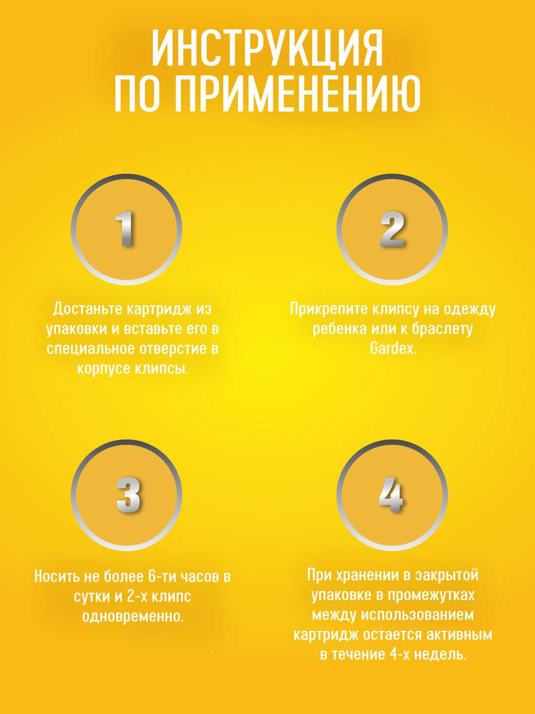 Способ применения : | Вскрыть упаковку и достать картридж. Вставить его в специальное гнездо в корпусе клипсы. Прикрепить клипсу к одежде - на пояс, нагрудный карман куртки, рубашки и т.д.. Для усиления защитного действия можно использовать несколько клипс одновременно. Средство снижает количество укусов комаров при их низкой и средней численности не менее 4 недель при хранении картриджа в промежутках между использованиями в закрытой упаковке.Не применять детям до 2 лет, беременным и кормящим женщинам, а также лицам с повышенной чувствительностью к химическим веществам. Использовать браслеты только на открытом воздухе. Не размещать клипсу близко к органам дыхания. Детям использовать под контролем взрослых, носить не более 2 клипс одновременно до 6 часов в сутки. |