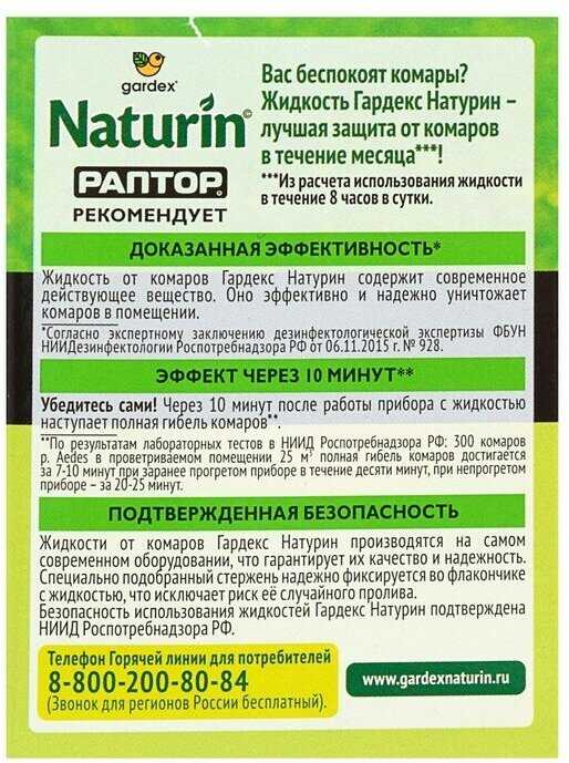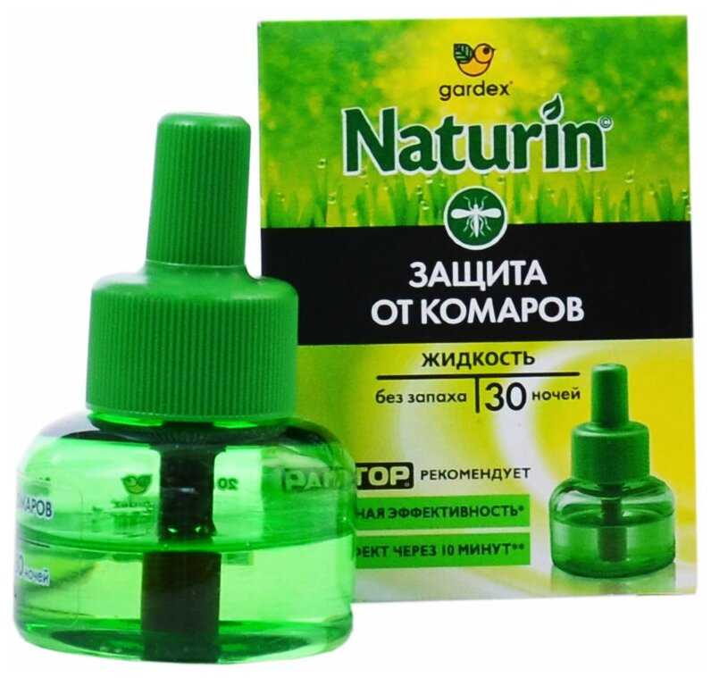 | Дополнительная информация : | Жидкость от комаров Gardex Naturin без запаха предназначена для заправки аппарата для отпугивания комаров. Данное средство обеспечивает надежную защиту от комаров в помещении на 30 ночей. Жидкость имеет высокую эффективность: гибель комаров начинается через 10 минут после включения прибора в сеть, что поможет вам быстро избавиться от любого количества комаров в комнате. |