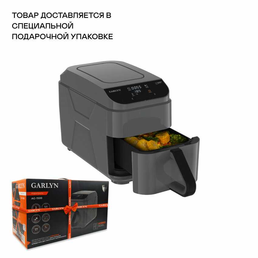 Аэрогриль Garlyn AG-1500 обеспечивает равномерную пропеку за счёт циркуляции горячего воздуха, блюда получаются сочными внутри с румяной корочкой снаружи — курица 1 кг запекается целиком без пересыхания, рыба целиком в удлинённой чаше сохраняет форму и вкус, овощи пропитываются соками с верхней решётки. Выпечка (кексы, печенье, пирожки) выходит пышной на нескольких уровнях, картофель фри или по-деревенски (кубики 1-2 см) хрустящим с минимумом масла, шашлык и ребрышки имитируют вкус с костра при добавлении щепы. Пользователи отмечают превосходство над духовкой (равномерность тушения рагу из кабачков, жаркого без подгорания) и мультиваркой (быстрее, без накопления жира), омлет из 2 яиц с молоком не оседает после остывания. Предустановленные 17 программ (курица, говядина, рыба, фри, выпечка) работают точно, но по книге рецептов иногда требуется добавление 1,5-2 раза времени для полной прожарки больших кусков. Готовит быстрее скороварки, на семью из 4 человек порциями с запасом, низкокалорийно без масла.