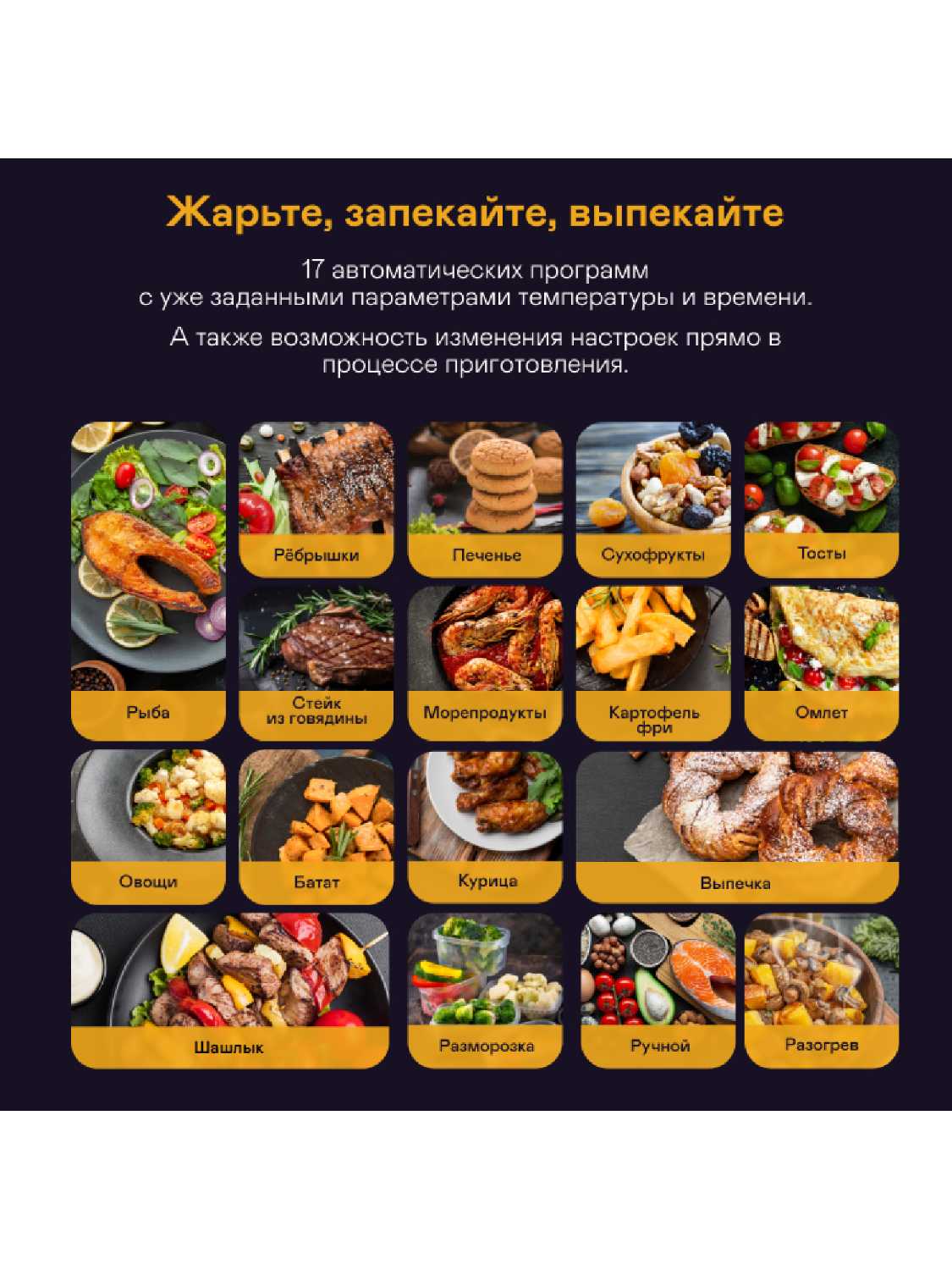 Есть семнадцать автоматических программ. Это и курица, и говядина, и рыба, и ребрышки и возможность выпекать, делать печенье, картошку фри и еще много всякого-разного.