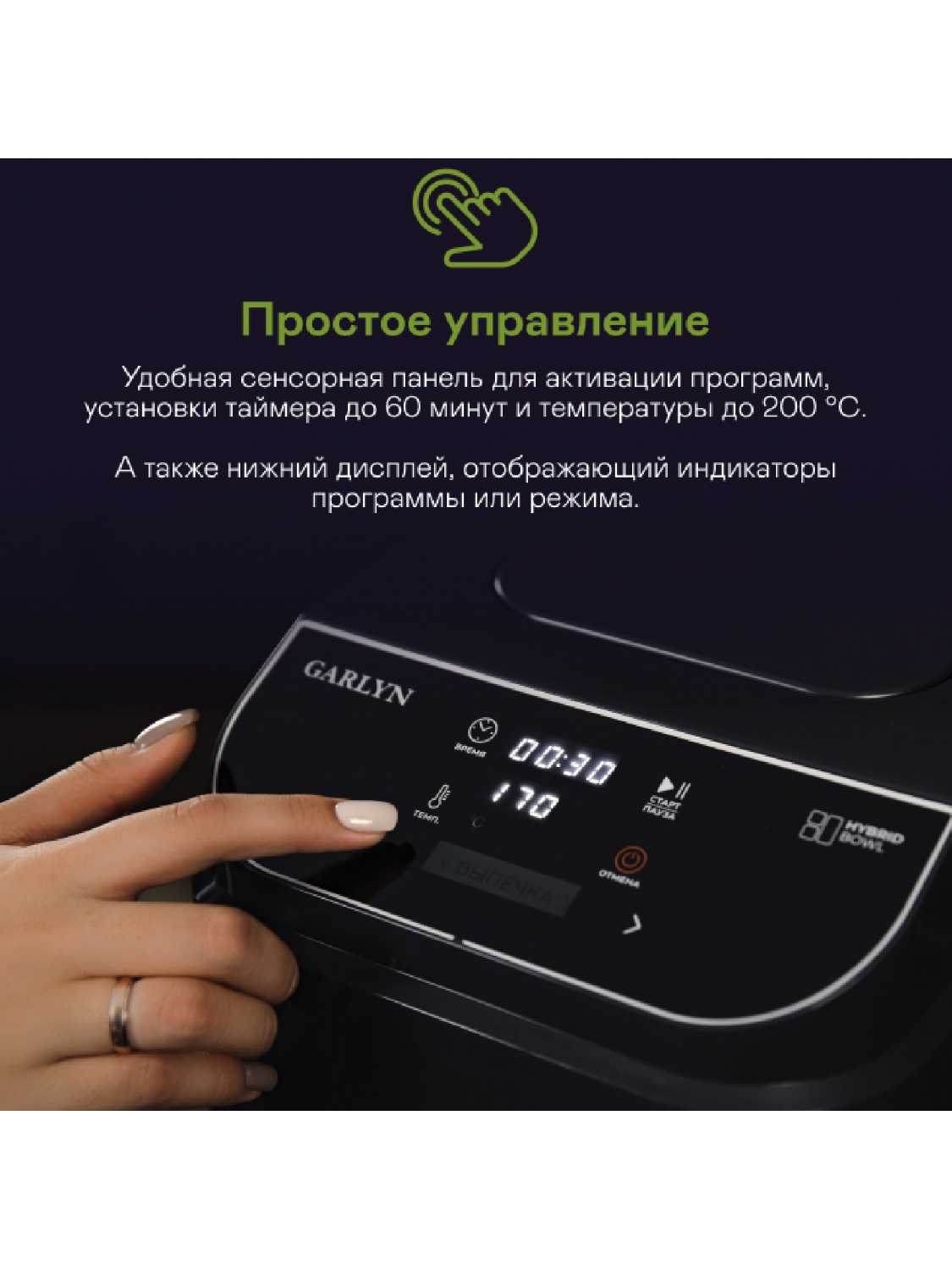 Нагрев происходит, не как в мультиварке, а тут циркулирует горячий воздух, которым и готовится пища. Управление сенсорное, удобно - вся информация отображается, при этом сам сенсор хорошо реагирует на прикосновение.